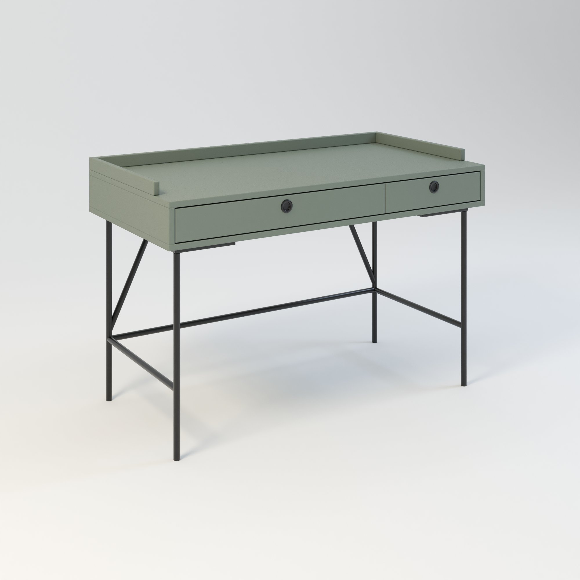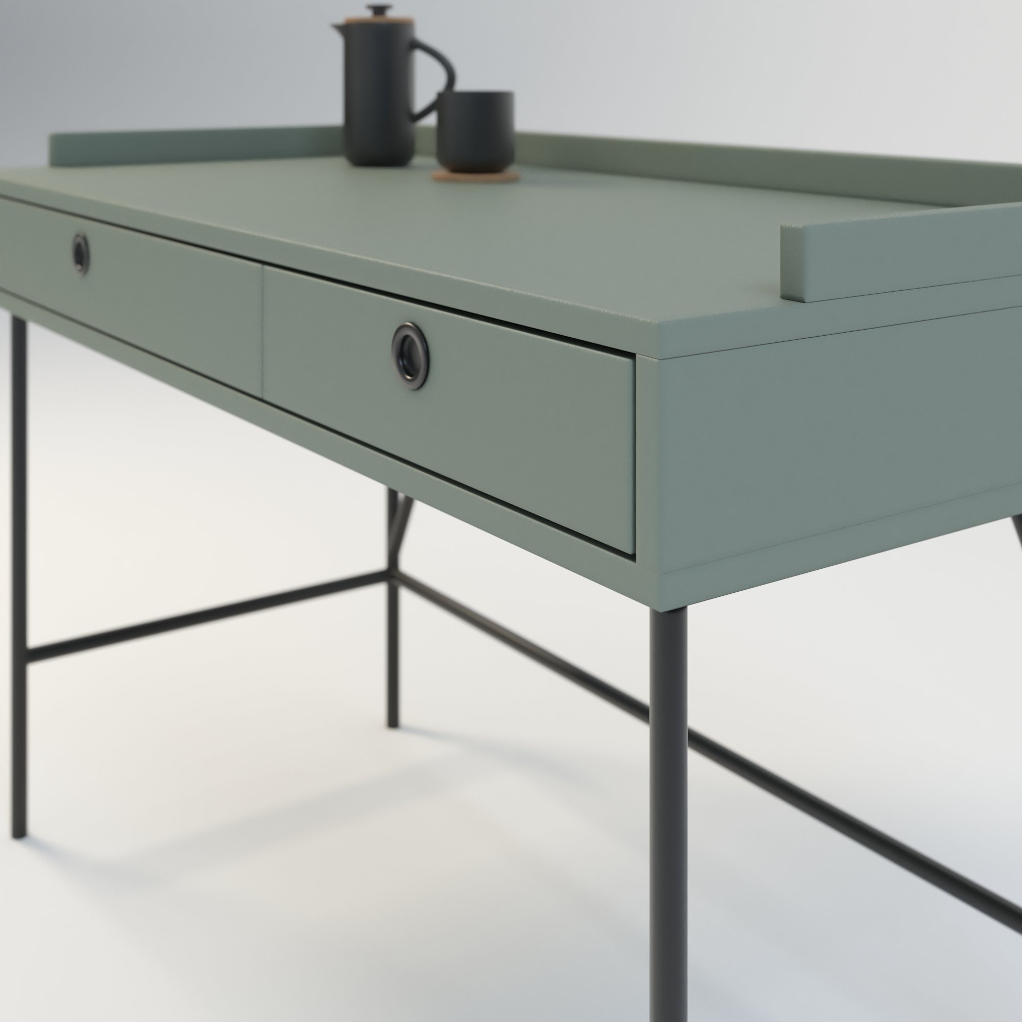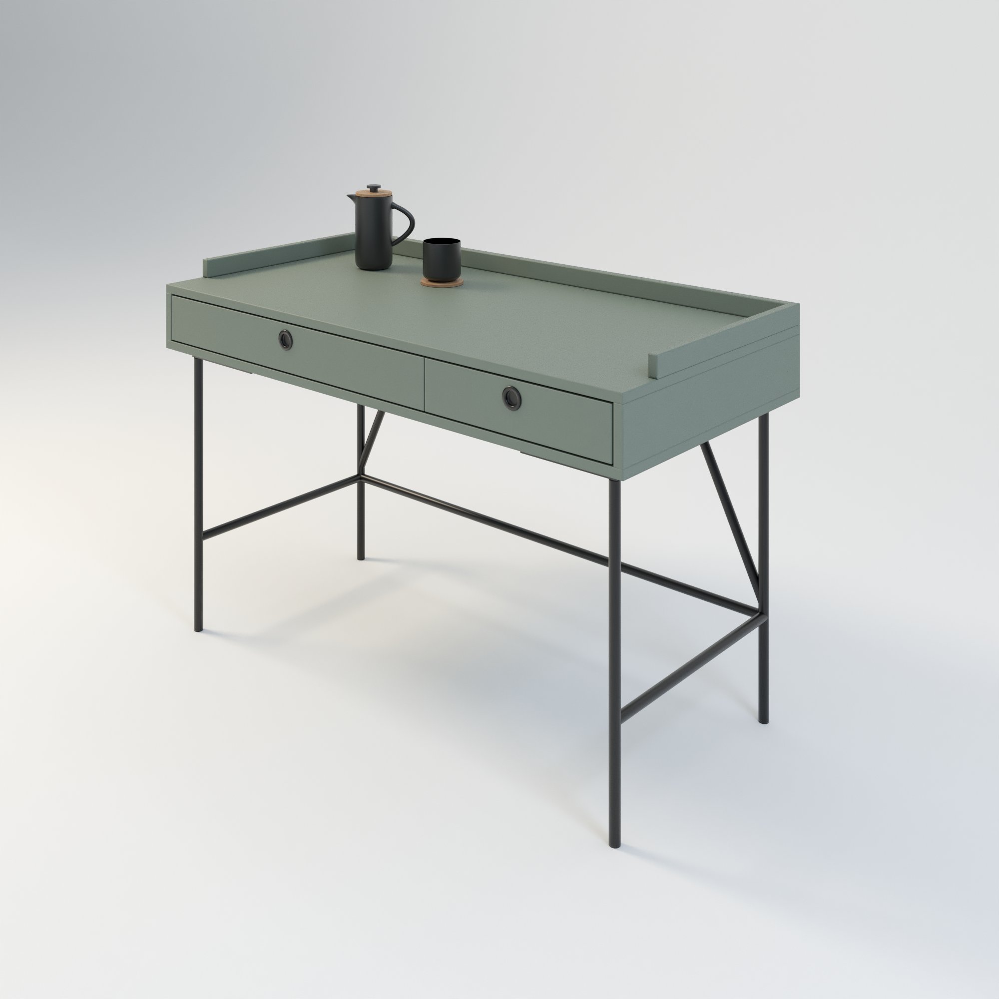 Biurko w stylu minimalistycznym. Zaprojektowane z myślą o osobach ceniących sobie prostotę i elegancję. Posiada 2 funkcjonalne szuflady. Wykonane w całości z wysokiej jakości płyty laminowanej w kolorze zielonym eukaliptusowym. Kolor ten doskonale sprawdza się połączeniu z innymi kolorami.
