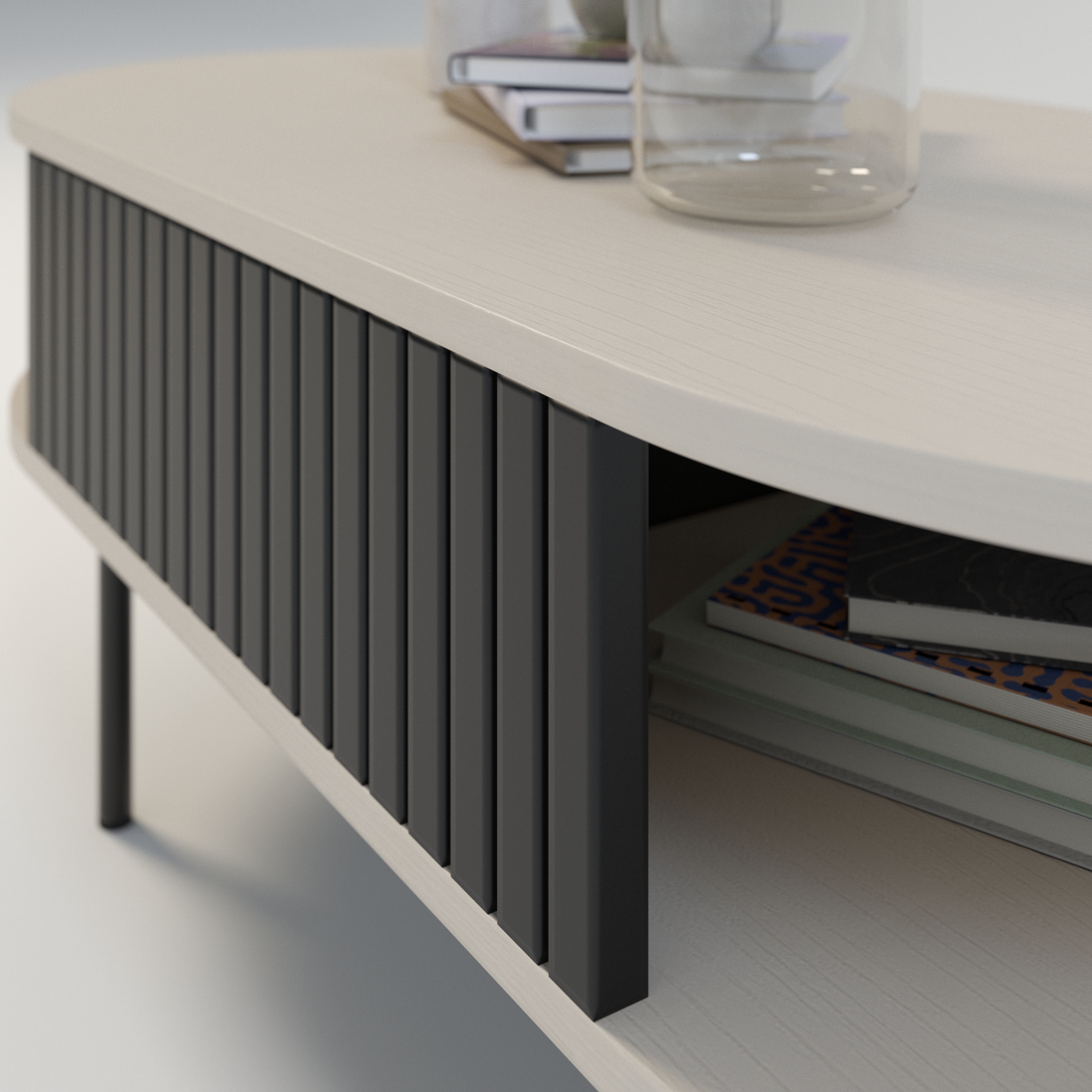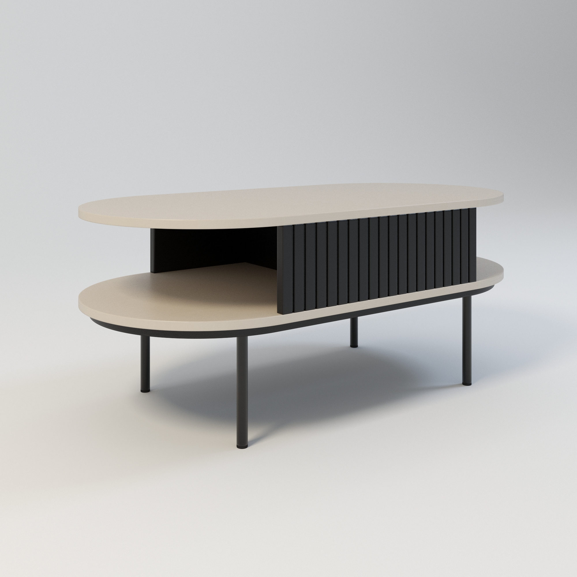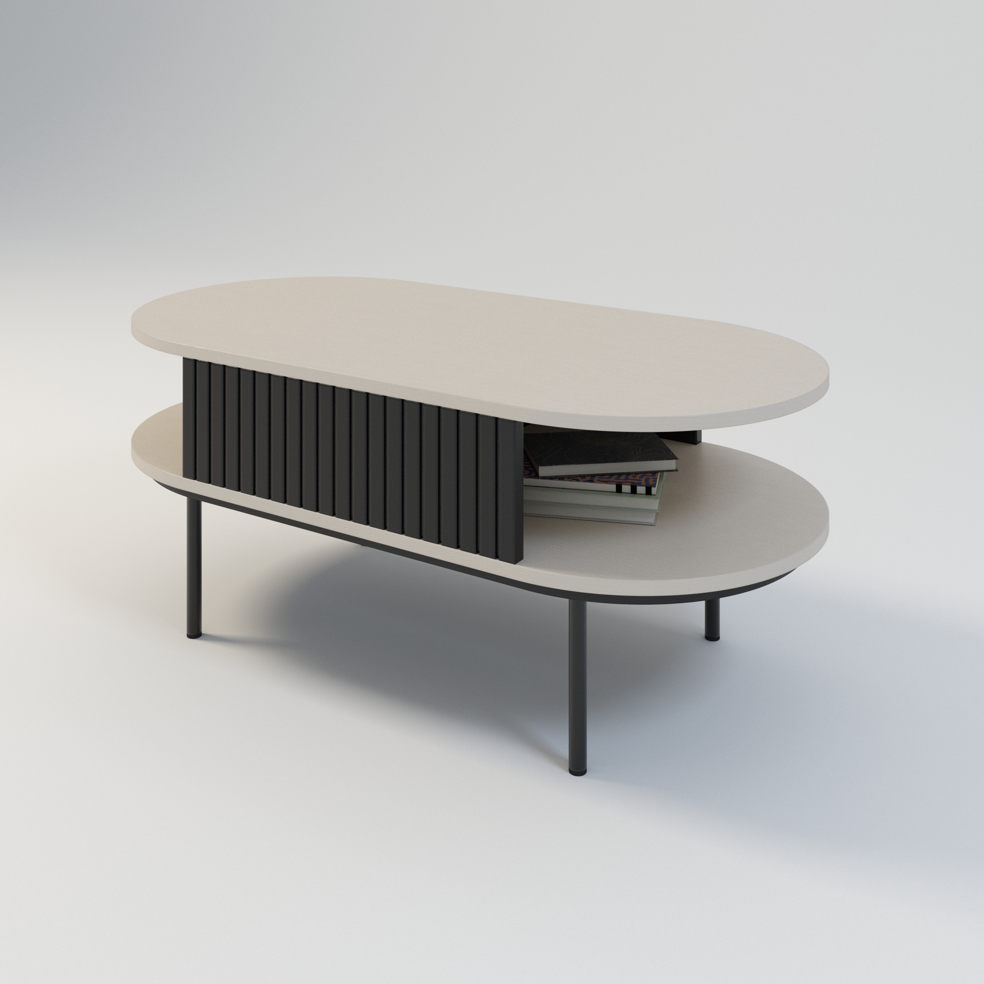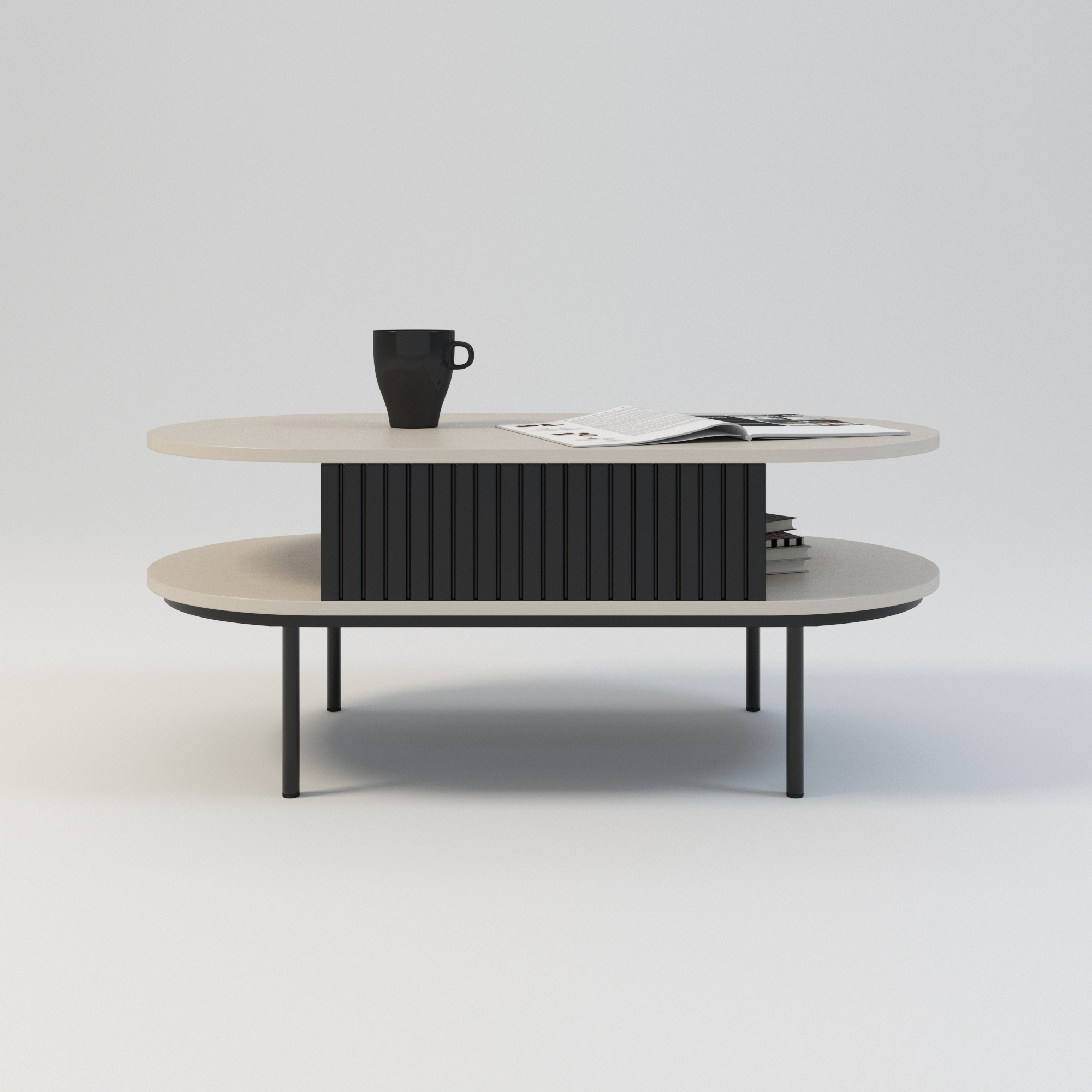 Boki stolika w kolorze czarnym oraz subtelne lamele nadają mu charakterystyczny, elegancki wygląd. To nie tylko stolik kawowy z lamelami, ale także stolik kawowy z półką, co czyni go niezwykle praktycznym – idealnym do przechowywania czasopism, pilotów czy dekoracji. Jako stolik kawowy czarny o owalnym kształcie, doskonale wpisuje się w styl klasyczny, nowoczesny, a także skandynawski.