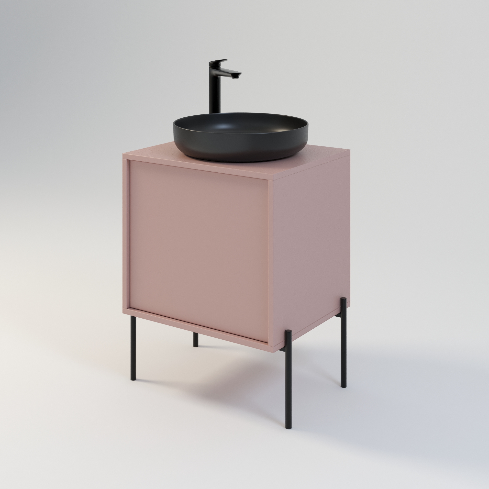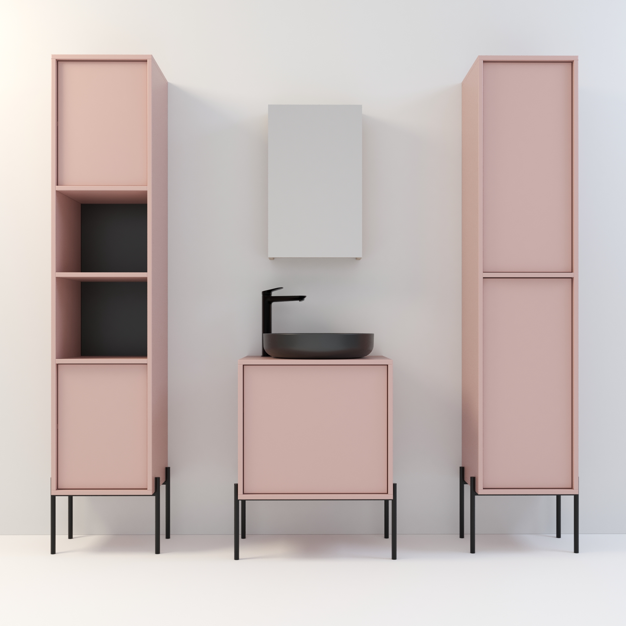 Szafka łazienkowa w stylu minimalistycznym. Zaprojektowana z myślą o osobach ceniących sobie prostotę i elegancję. Drzwi wpuszczone w korpus, otwierane za pomocą bezawaryjnych zawiasów i mechanizmu tip on. Szafka dostępna jest również w opcji z uchwytem drzwiowym. Szafka w całości wykonana z wysokiej jakości płyty laminowanej. Wewnątrz jedna półka. Szerokość szafki razem z nogami metalowymi wynosi odpowiednio 44 cm lub 54 cm. Wysokość korpusu szafki to 54 cm, natomiast wysokość metalowego stelaża / nóg to 26 cm. Regulowane stopy zapewniają idealne wypoziomowanie. Umywalka nie wchodzi w skład zestawu.