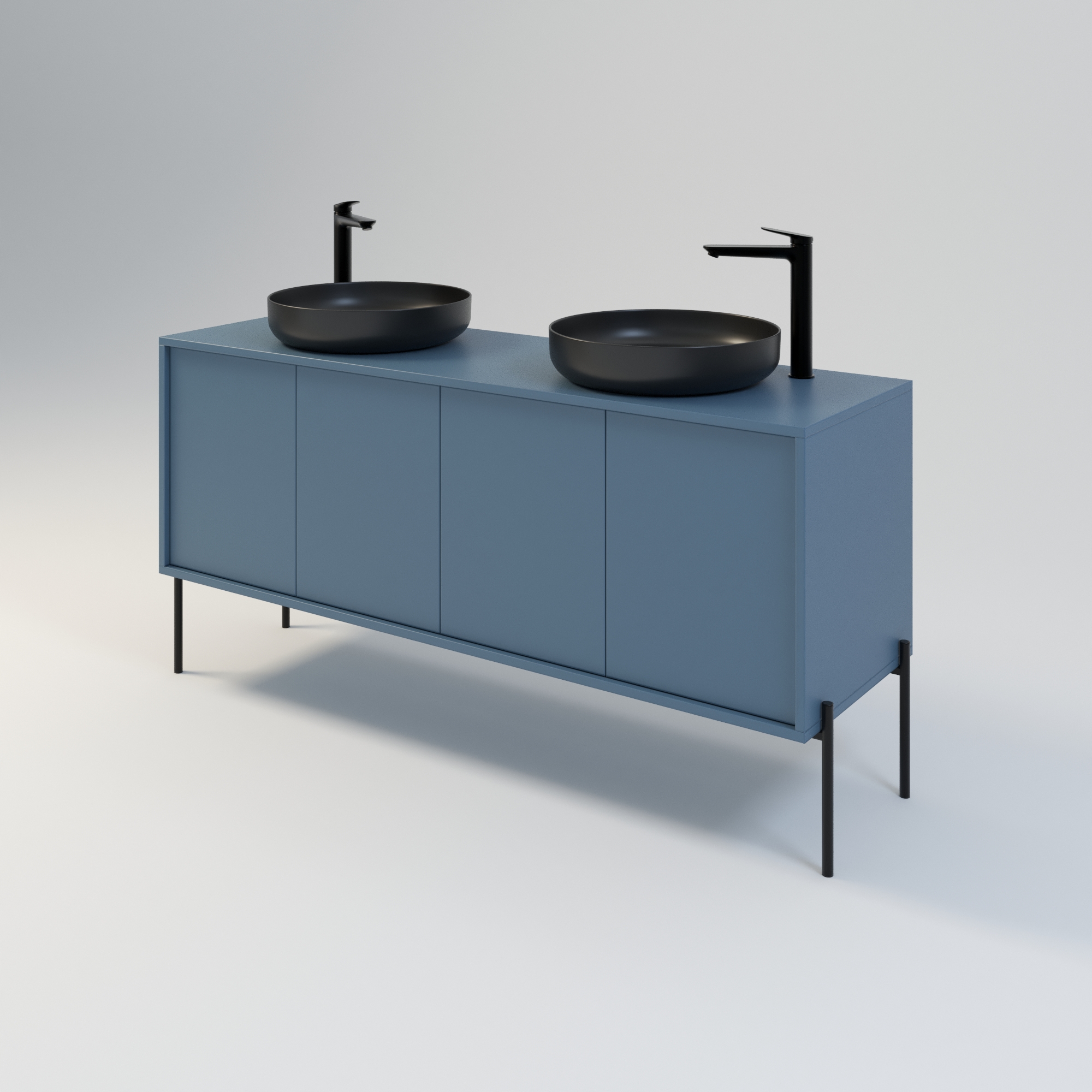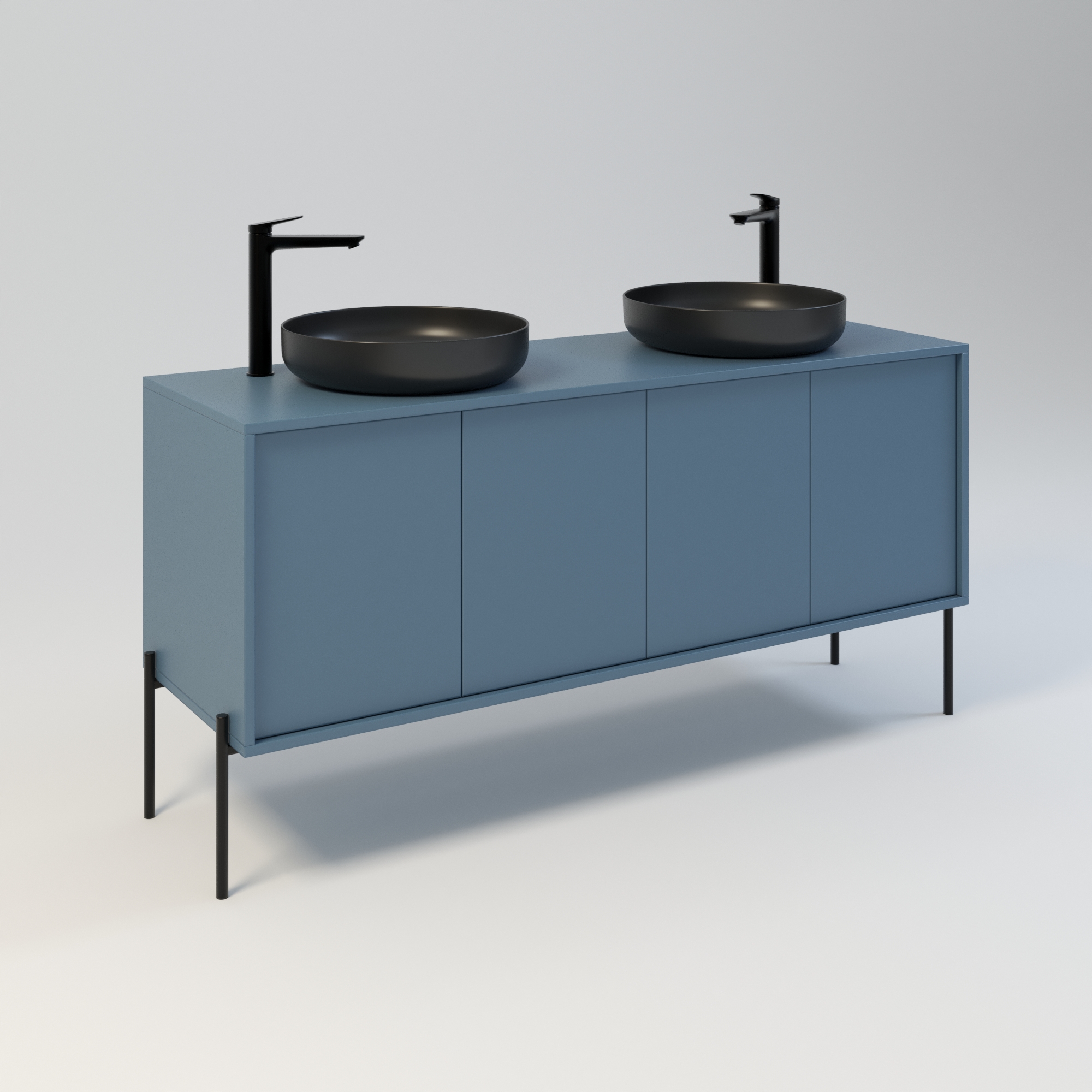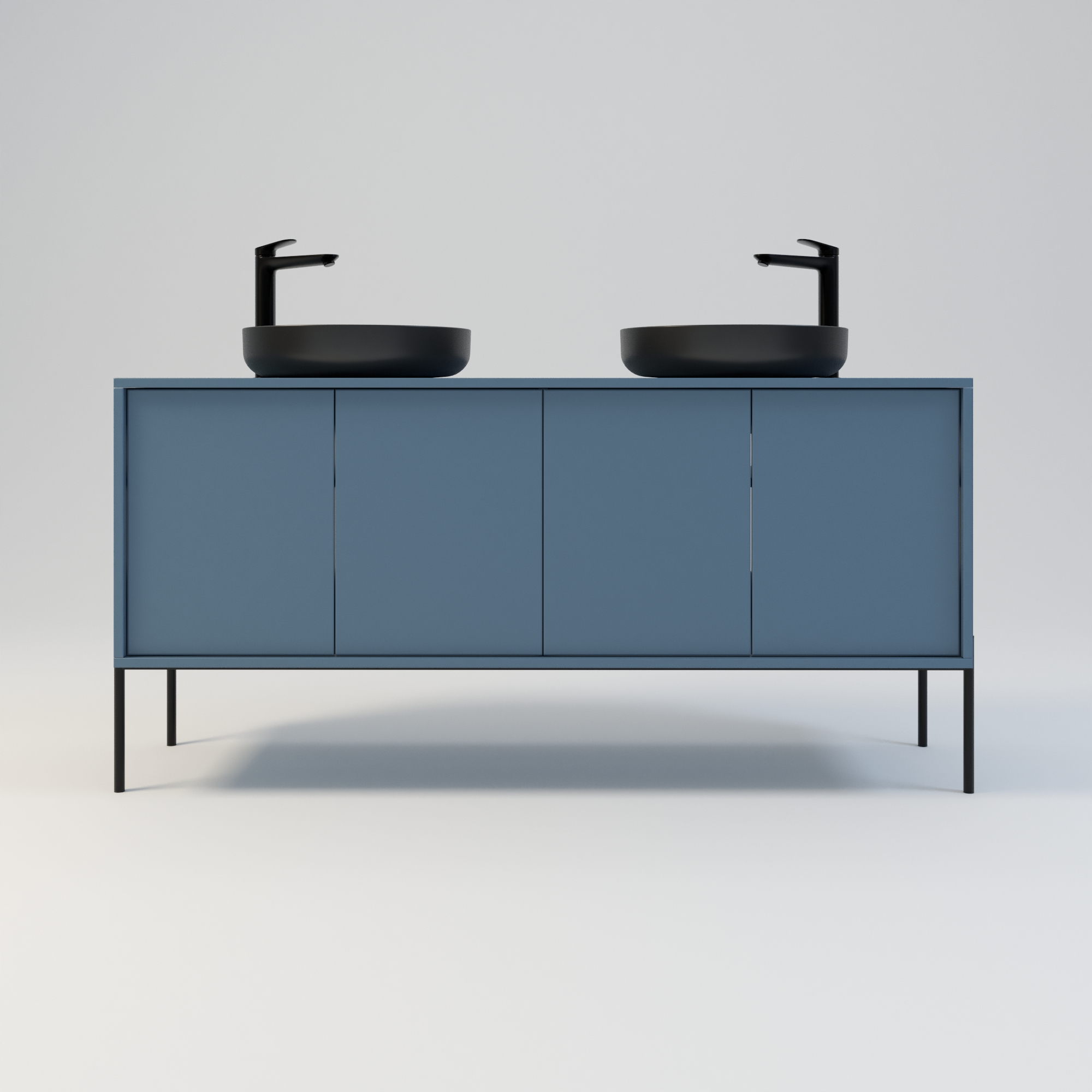 Szafka łazienkowa w stylu minimalistycznym. Zaprojektowana z myślą o osobach ceniących sobie prostotę i elegancję. Drzwi wpuszczone w korpus, otwierane za pomocą bezawaryjnych zawiasów i mechanizmu tip on. Szafka dostępna jest również w opcji z uchwytami drzwiowymi. Szafka w całości wykonana z wysokiej jakości płyty laminowanej. Wewnątrz każdej komory drzwiowej jedna półka. Szerokość szafki razem z nogami metalowymi wynosi 164 cm. Wysokość korpusu szafki to 54 cm, natomiast wysokość metalowego stelaża / nóg to 26 cm. Regulowane stopy zapewniają idealne wypoziomowanie. Szafka umożliwia montaż dwóch umywalek w dowolnej konfiguracji: po stronie lewej, prawej lub symetrycznie. Umywalki nie wchodzą w skład zestawu.