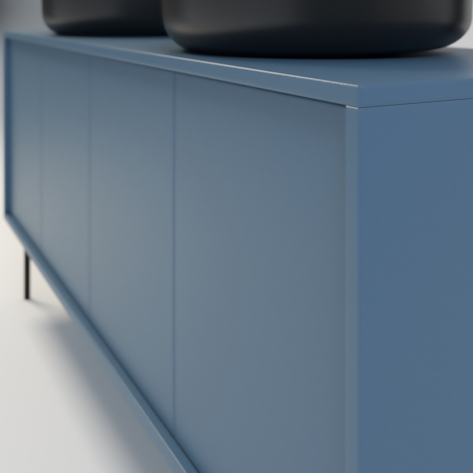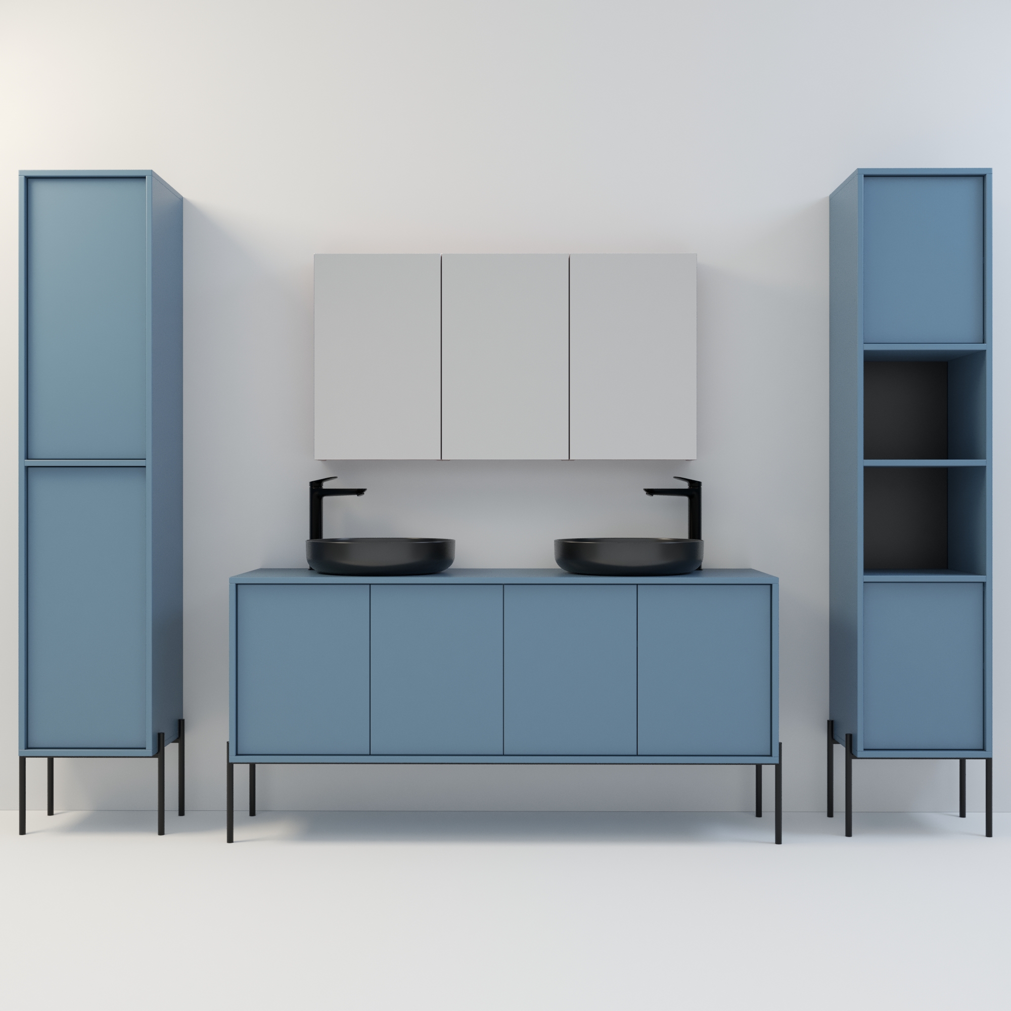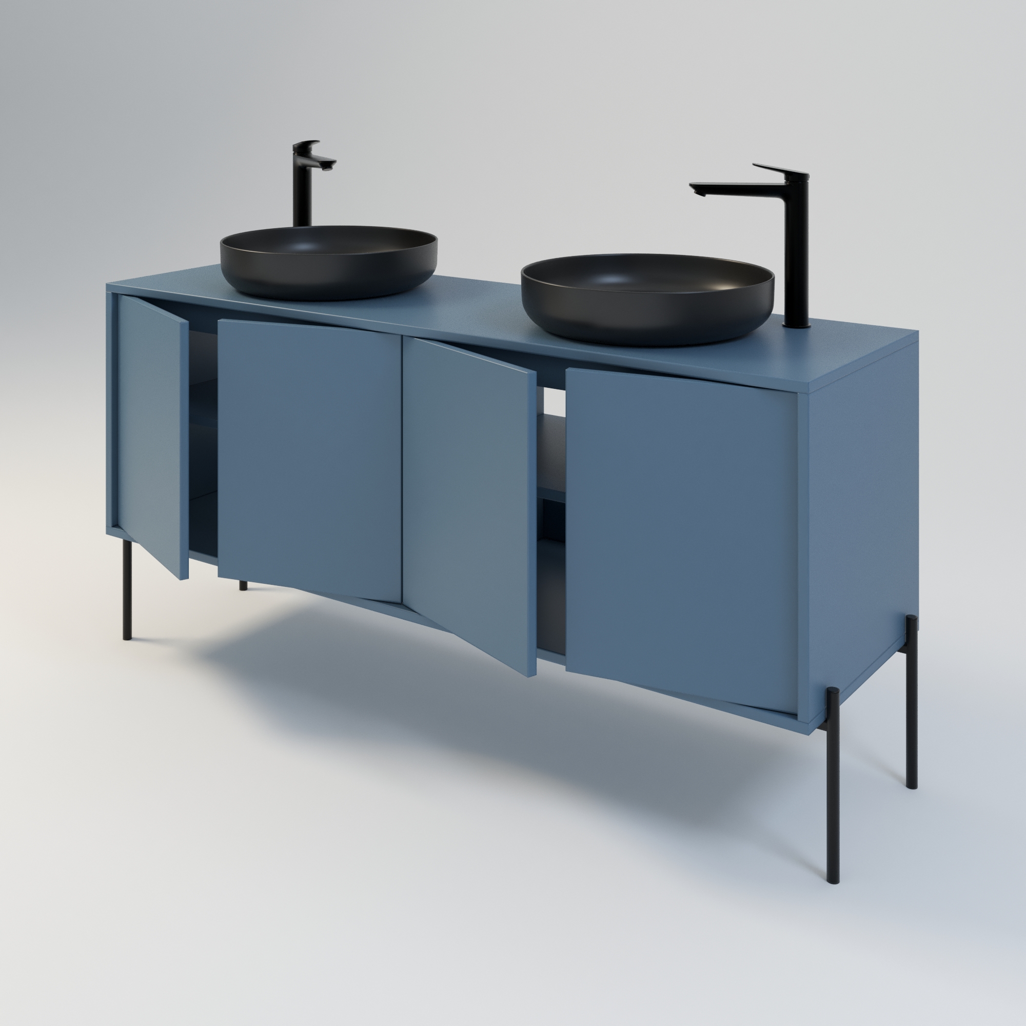 Szafka łazienkowa w stylu minimalistycznym. Zaprojektowana z myślą o osobach ceniących sobie prostotę i elegancję. Drzwi wpuszczone w korpus, otwierane za pomocą bezawaryjnych zawiasów i mechanizmu tip on. Szafka dostępna jest również w opcji z uchwytami drzwiowymi. Szafka w całości wykonana z wysokiej jakości płyty laminowanej. Wewnątrz każdej komory drzwiowej jedna półka. Szerokość szafki razem z nogami metalowymi wynosi 164 cm. Wysokość korpusu szafki to 54 cm, natomiast wysokość metalowego stelaża / nóg to 26 cm. Regulowane stopy zapewniają idealne wypoziomowanie. Szafka umożliwia montaż dwóch umywalek w dowolnej konfiguracji: po stronie lewej, prawej lub symetrycznie. Umywalki nie wchodzą w skład zestawu.