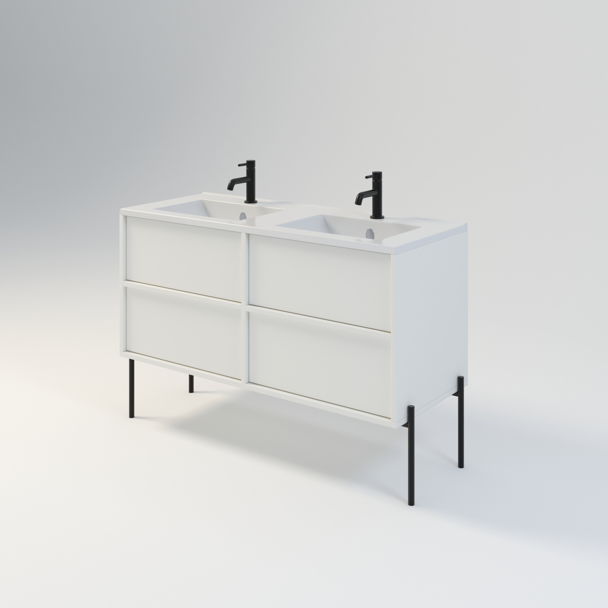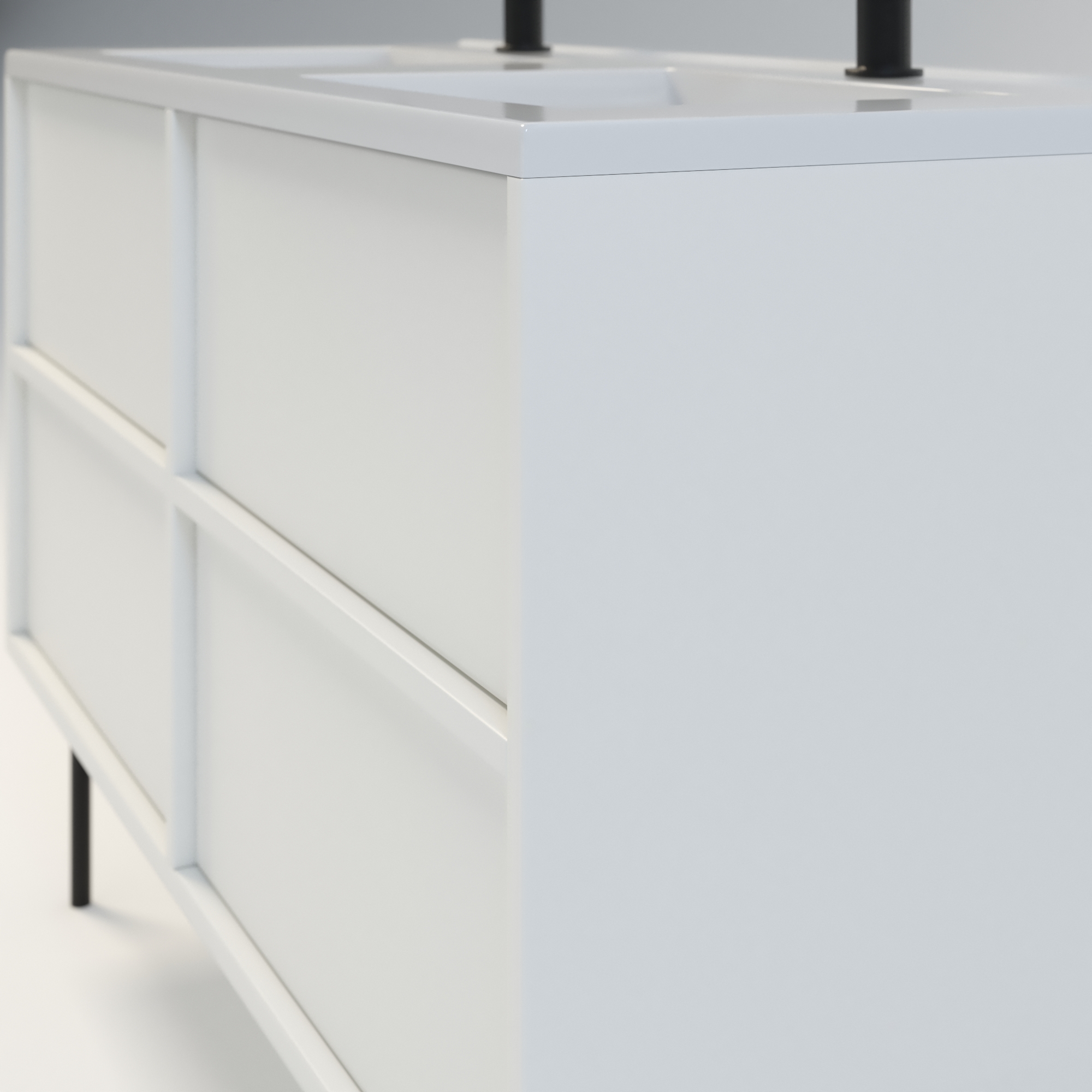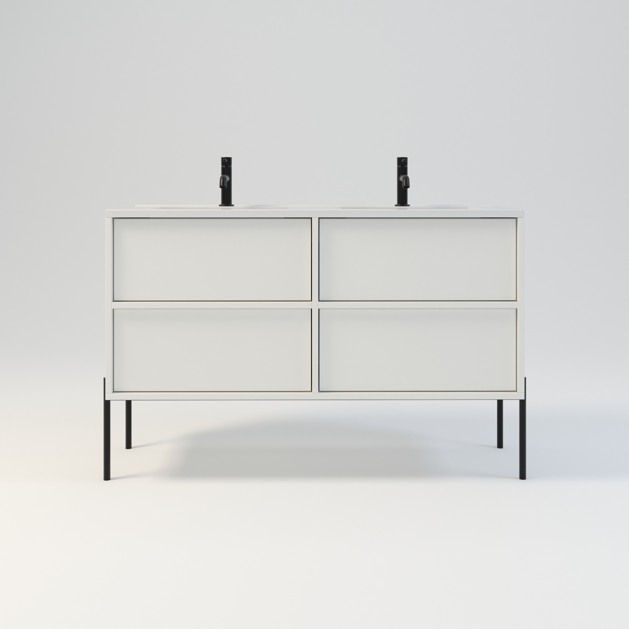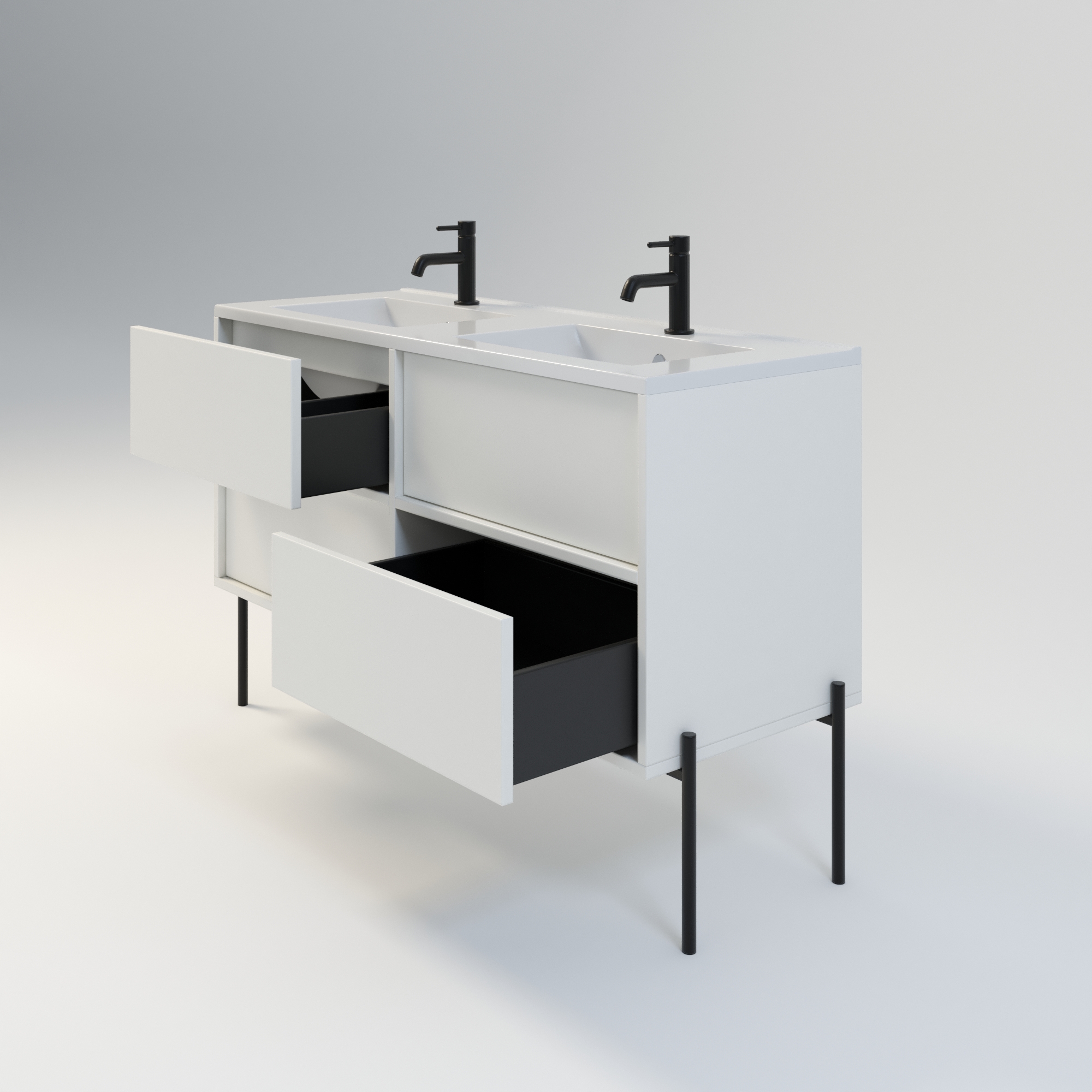 Szafka łazienkowa Minimal 4 z umywalką to nowoczesny zestaw łazienkowy który, składa się z szafki łazienkowej z czterema szufladami oraz podwójnej umywalki ceramicznej pełniącej jednocześnie funkcję blatu. Komplet ten jest niezwykle funkcjonalnym i trwałym rozwiązaniem. Połączenie uniwersalnego stylu z geometryczną formą sprawia, że szafka dobrze komponuje się w różnych aranżacjach.