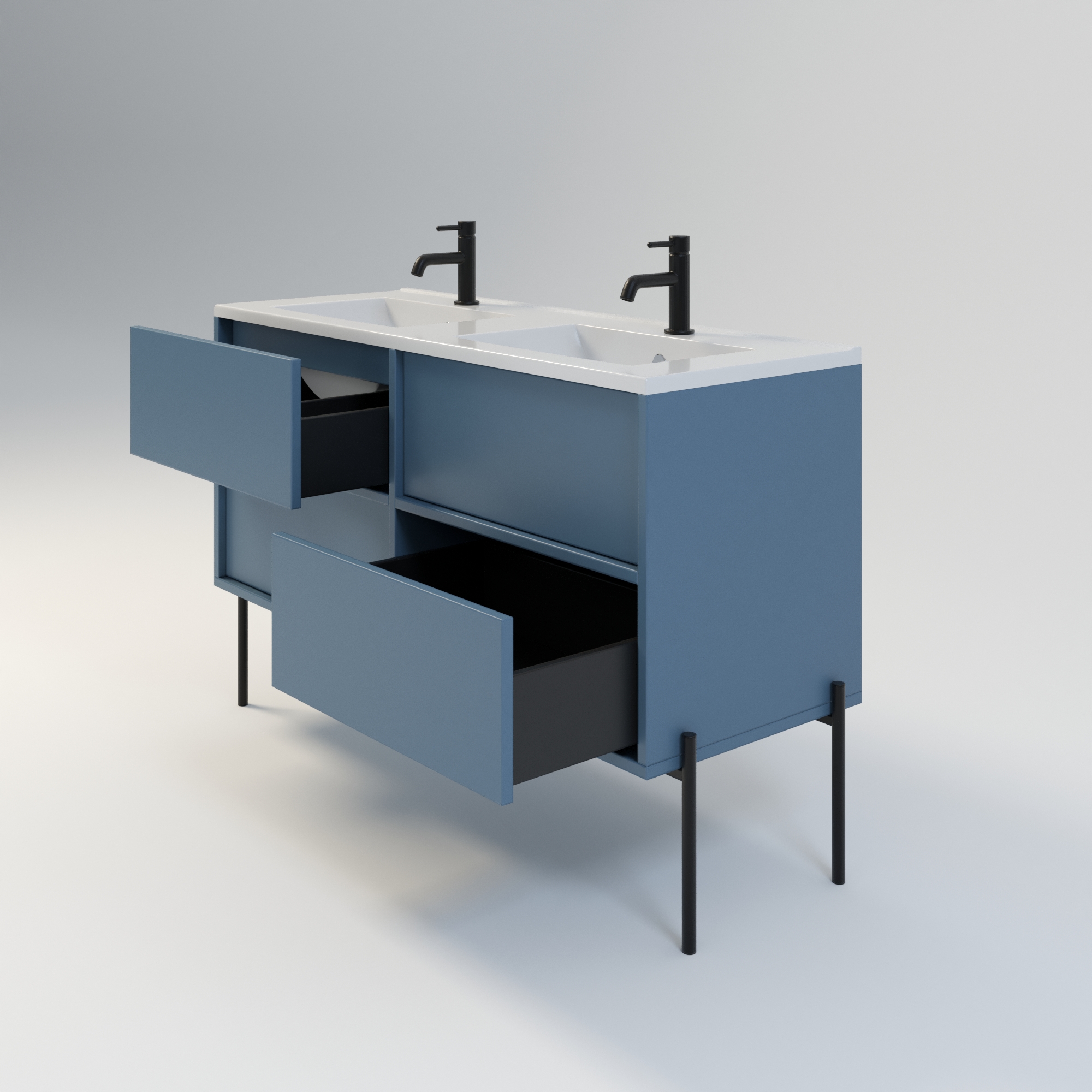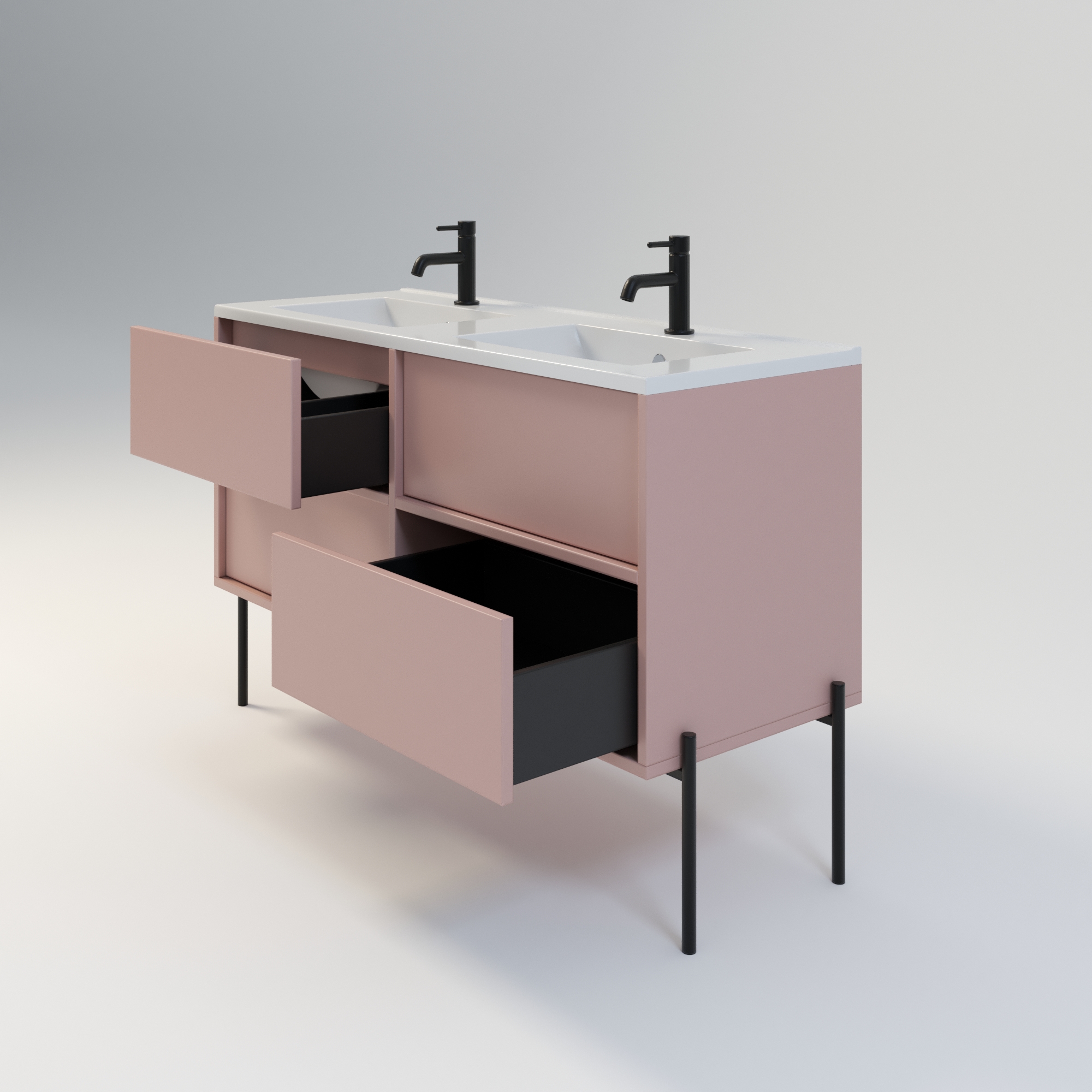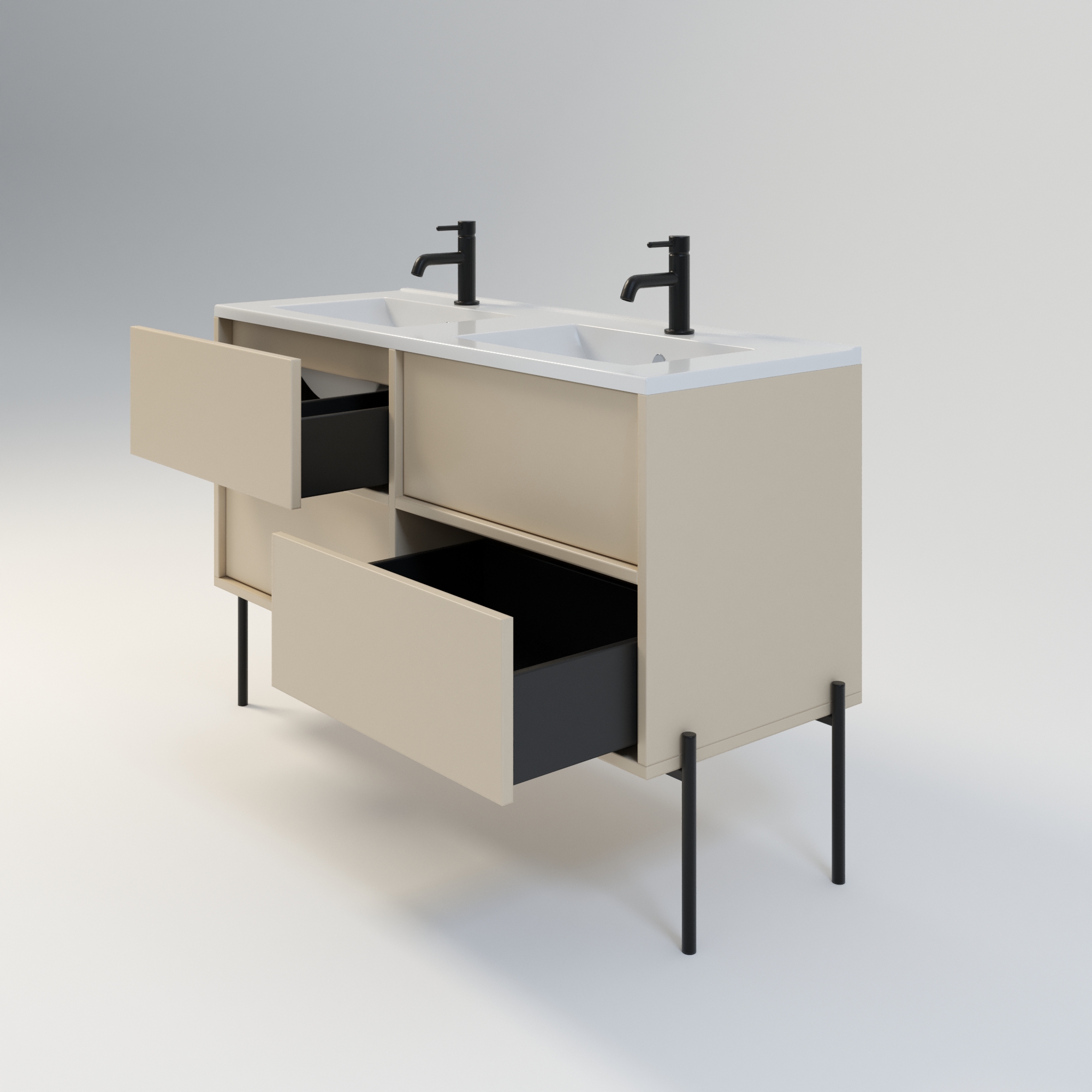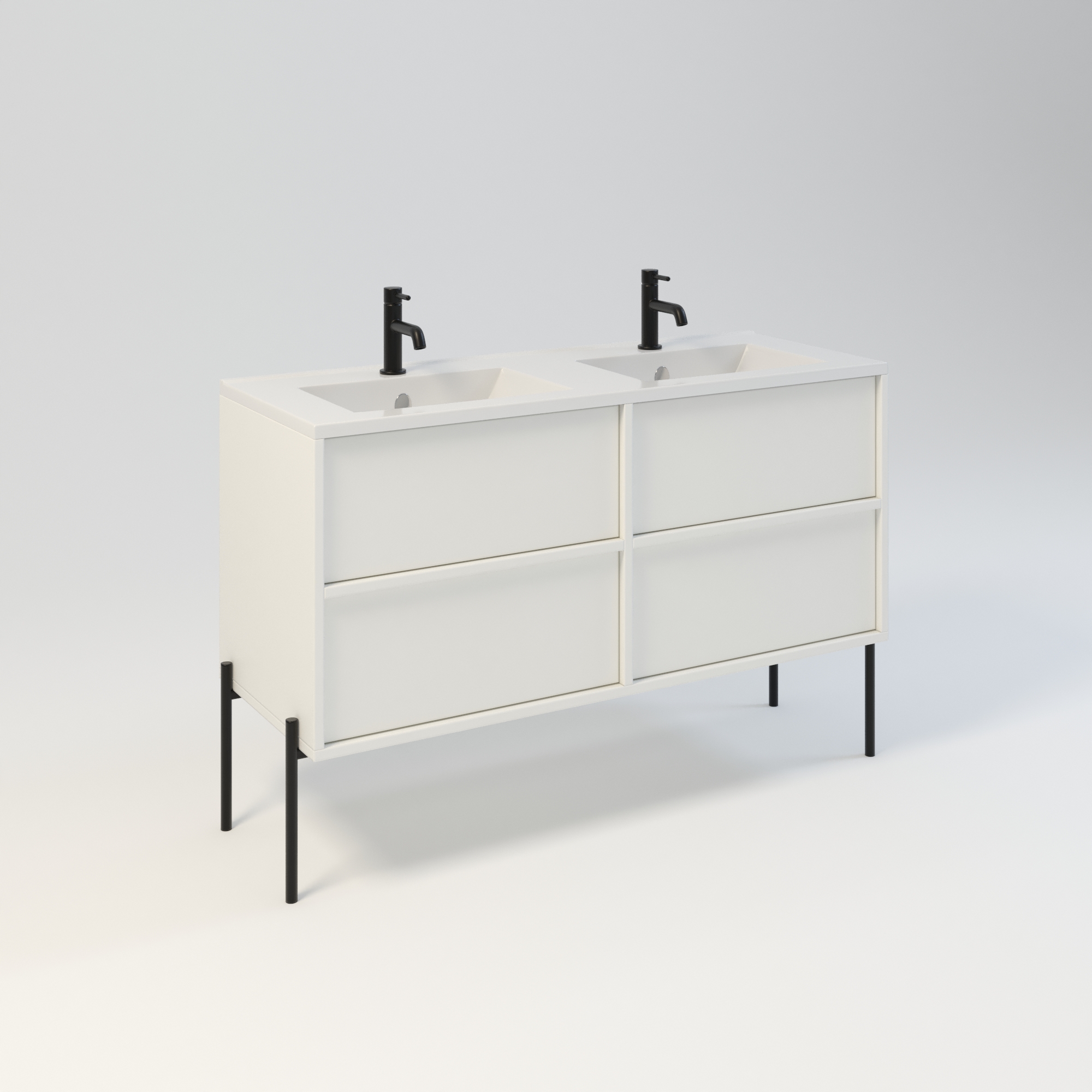 Szafka łazienkowa Minimal 4 z umywalką to nowoczesny zestaw łazienkowy który, składa się z szafki łazienkowej z czterema szufladami oraz podwójnej umywalki ceramicznej pełniącej jednocześnie funkcję blatu. Komplet ten jest niezwykle funkcjonalnym i trwałym rozwiązaniem. Połączenie uniwersalnego stylu z geometryczną formą sprawia, że szafka dobrze komponuje się w różnych aranżacjach.