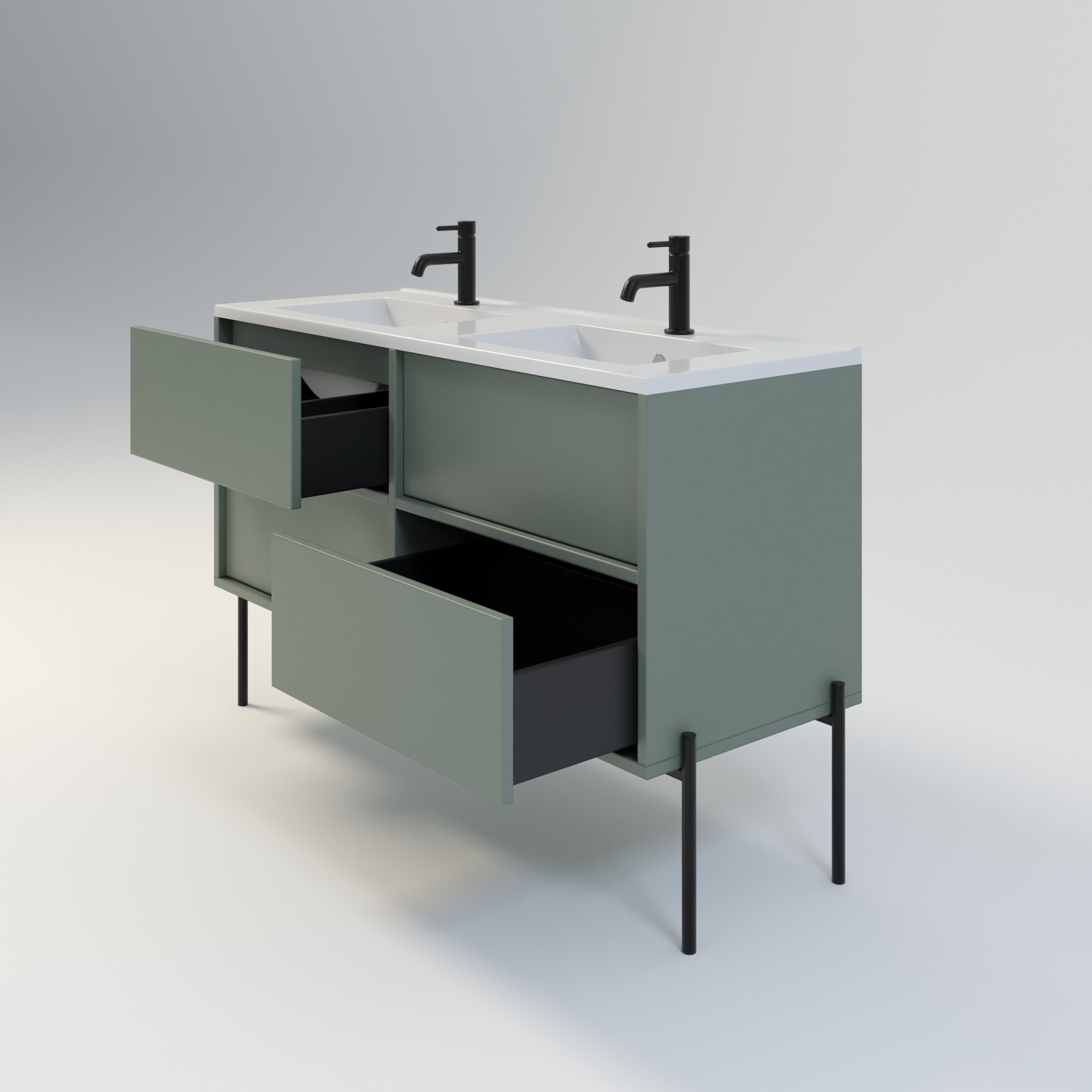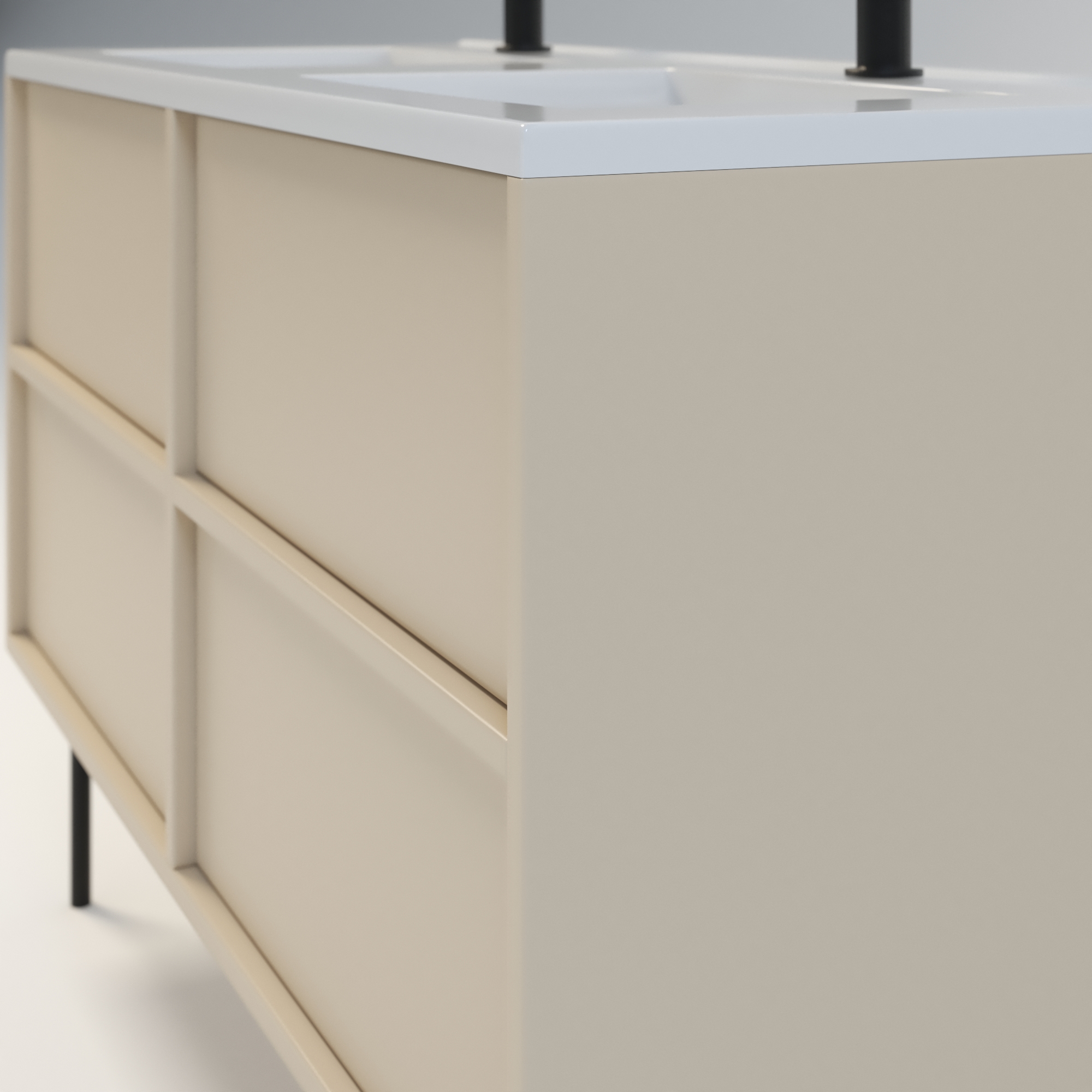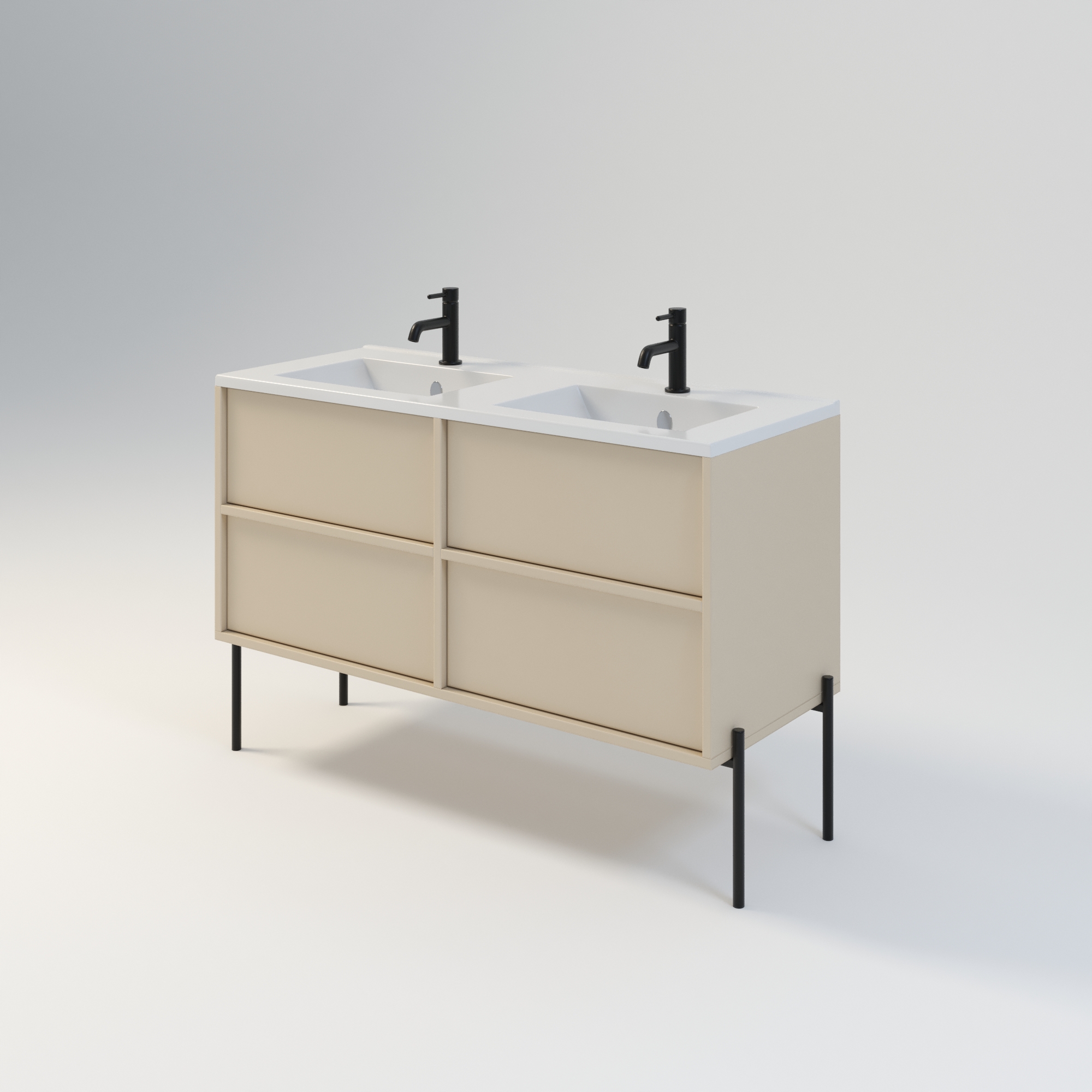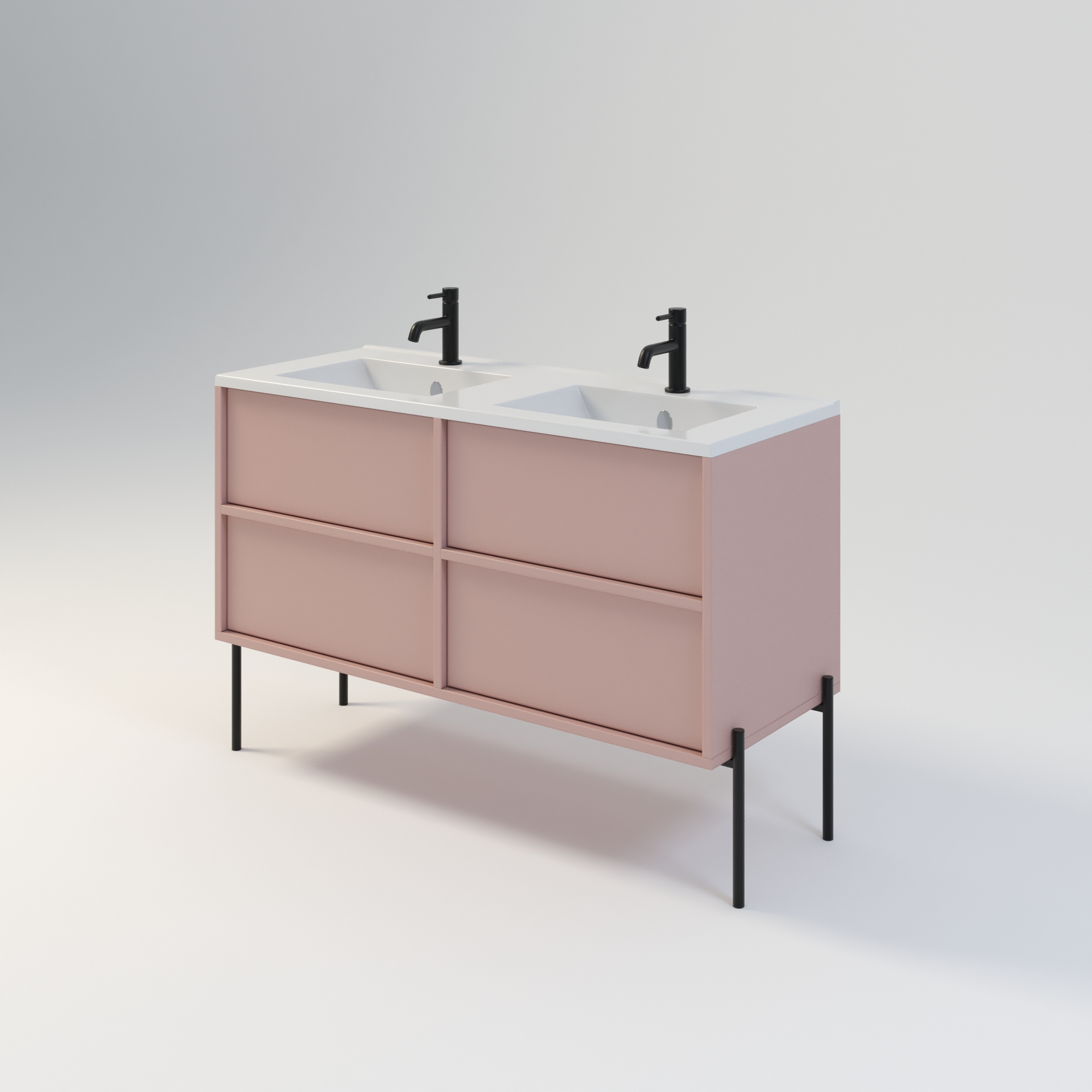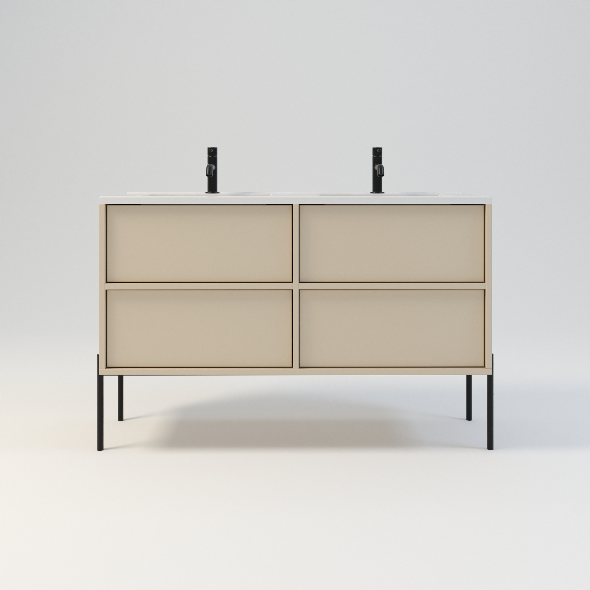 Szafka łazienkowa Minimal 4 z umywalką to nowoczesny zestaw łazienkowy który, składa się z szafki łazienkowej z czterema szufladami oraz podwójnej umywalki ceramicznej pełniącej jednocześnie funkcję blatu. Komplet ten jest niezwykle funkcjonalnym i trwałym rozwiązaniem. Połączenie uniwersalnego stylu z geometryczną formą sprawia, że szafka dobrze komponuje się w różnych aranżacjach.