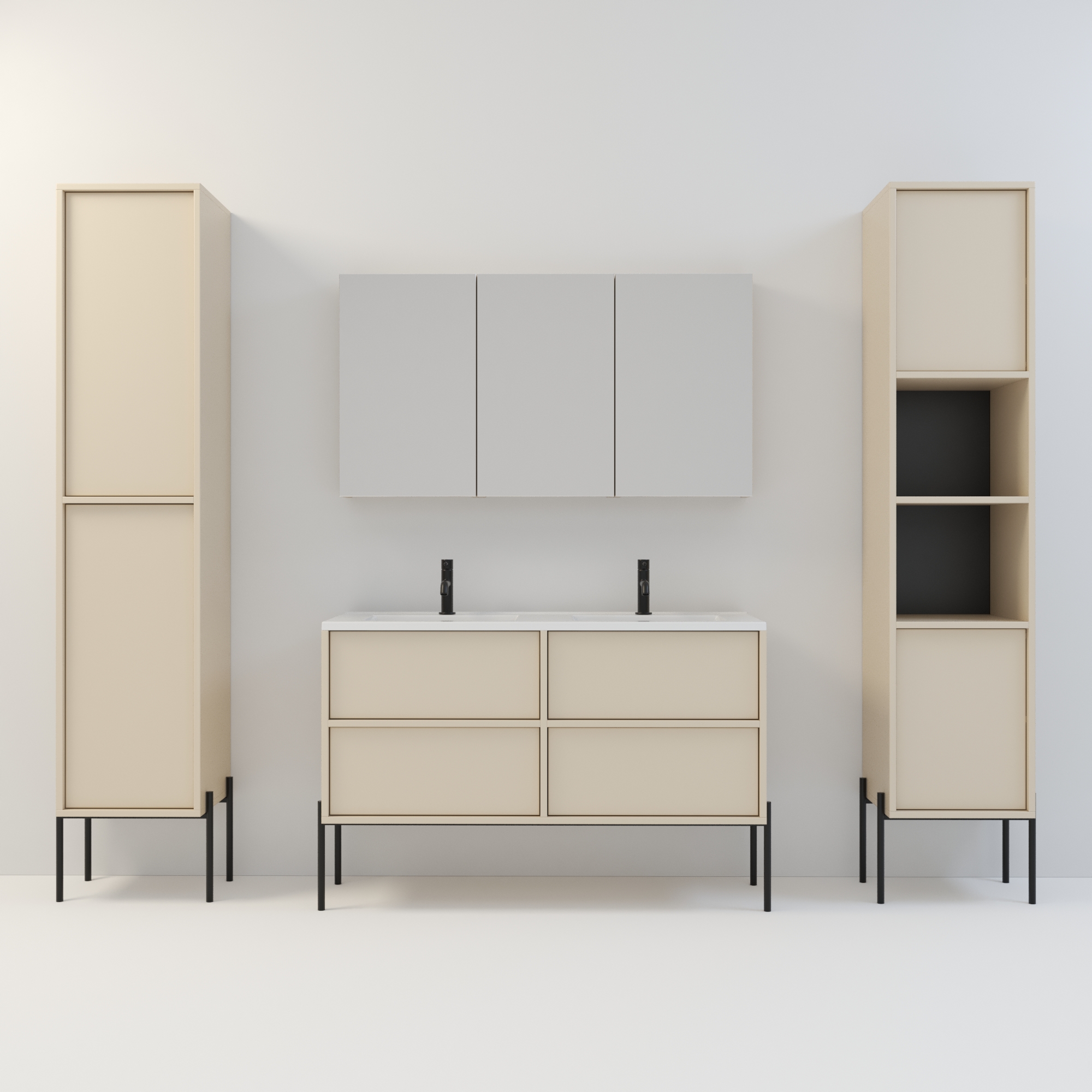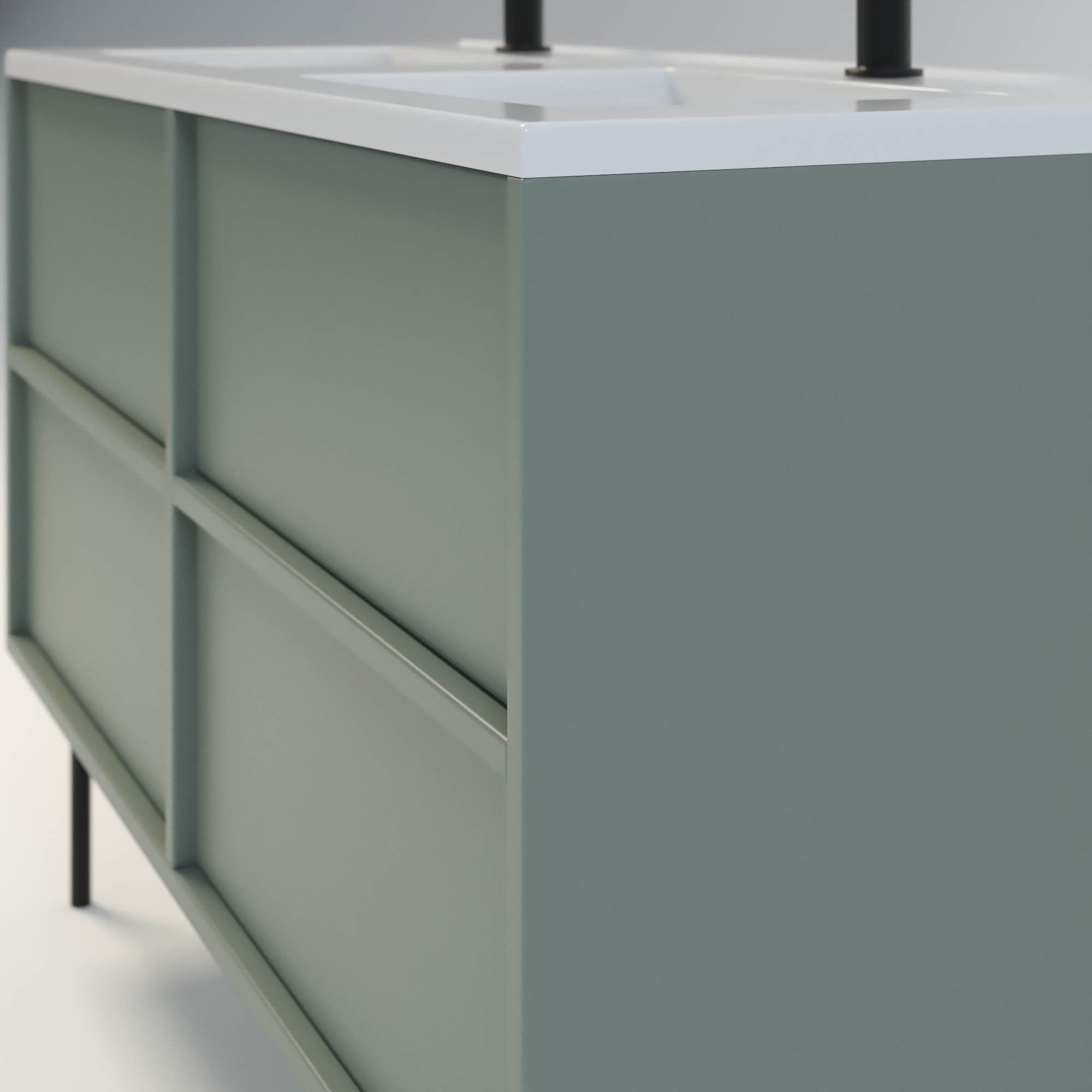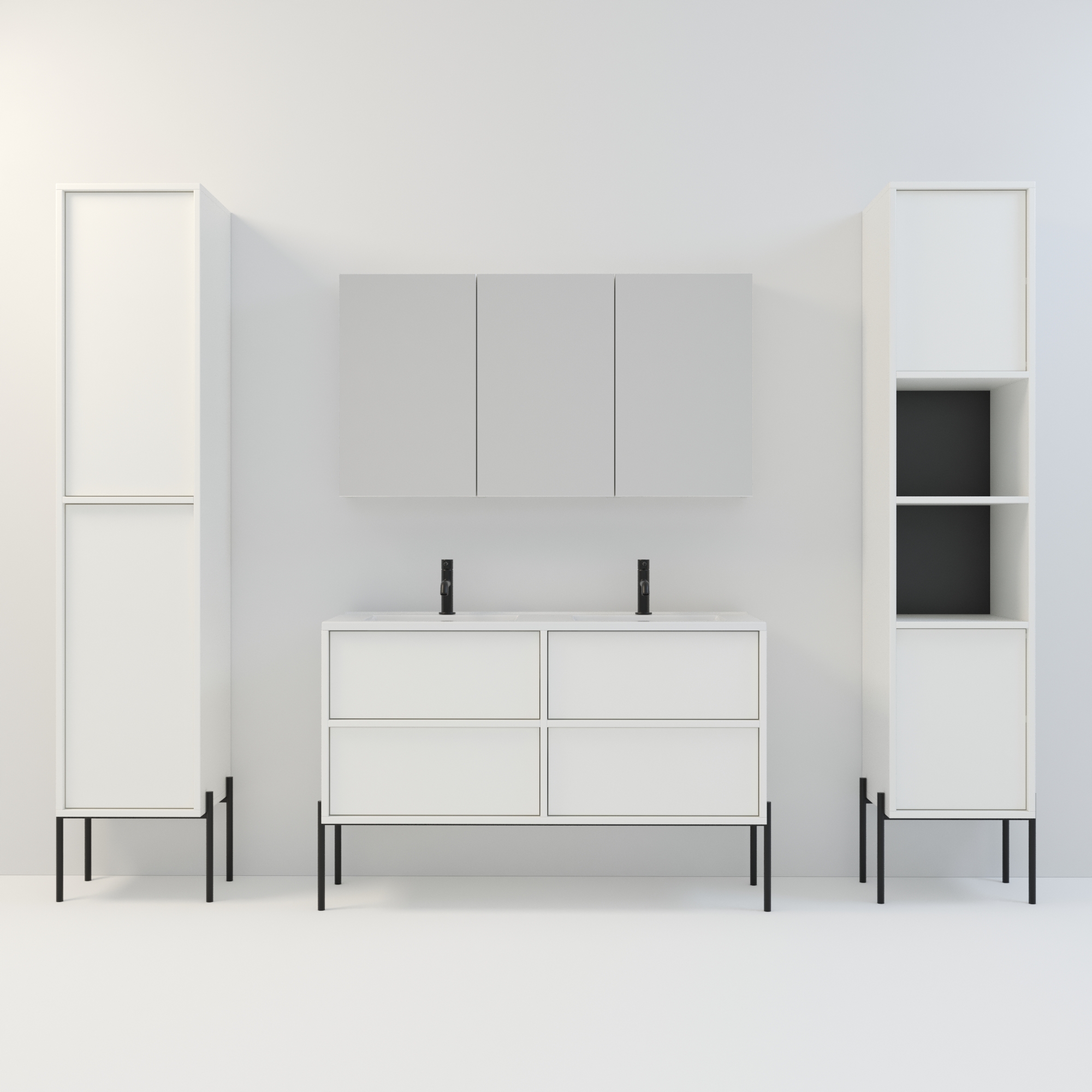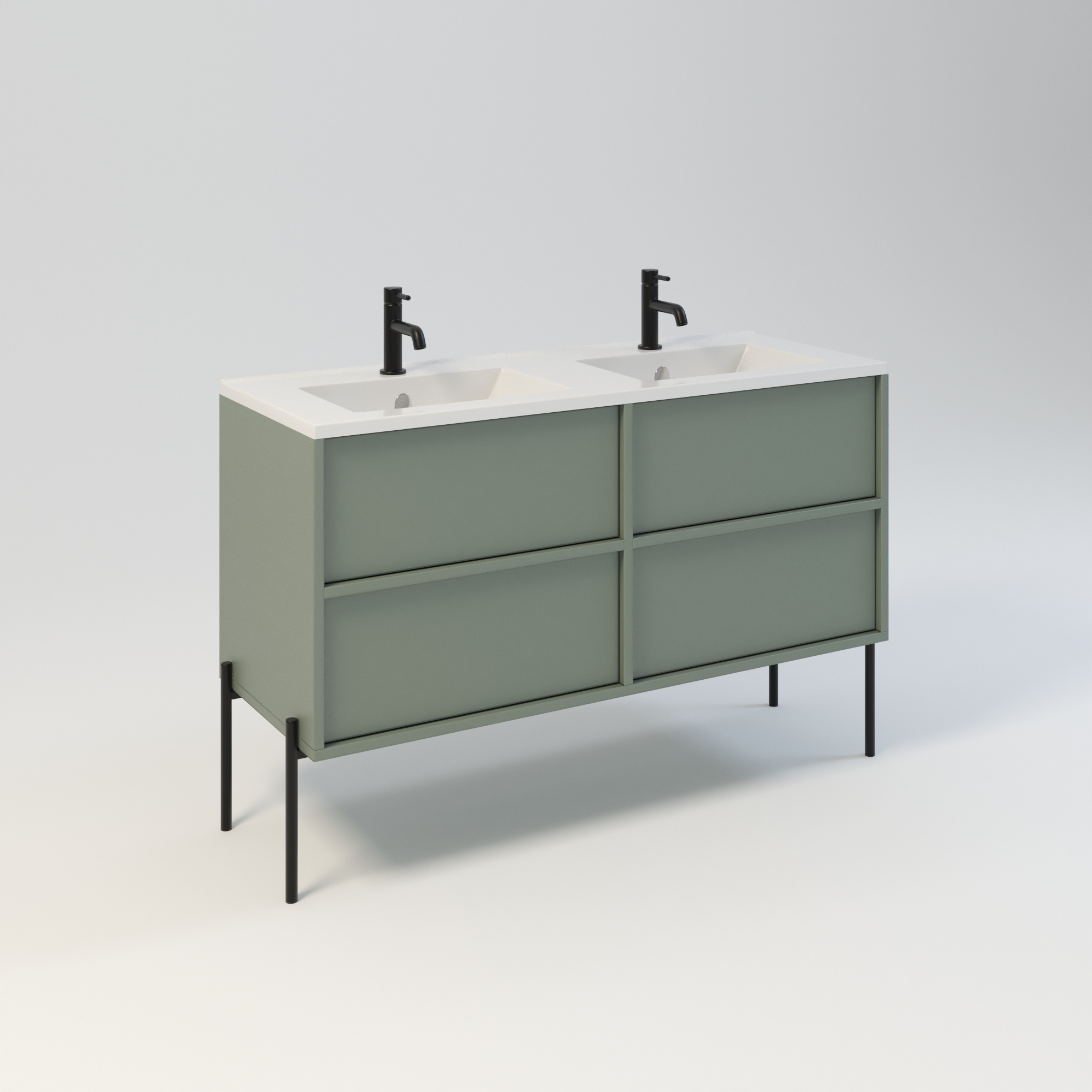 Szafka łazienkowa Minimal 4 z umywalką to nowoczesny zestaw łazienkowy który, składa się z szafki łazienkowej z czterema szufladami oraz podwójnej umywalki ceramicznej pełniącej jednocześnie funkcję blatu. Komplet ten jest niezwykle funkcjonalnym i trwałym rozwiązaniem. Połączenie uniwersalnego stylu z geometryczną formą sprawia, że szafka dobrze komponuje się w różnych aranżacjach.