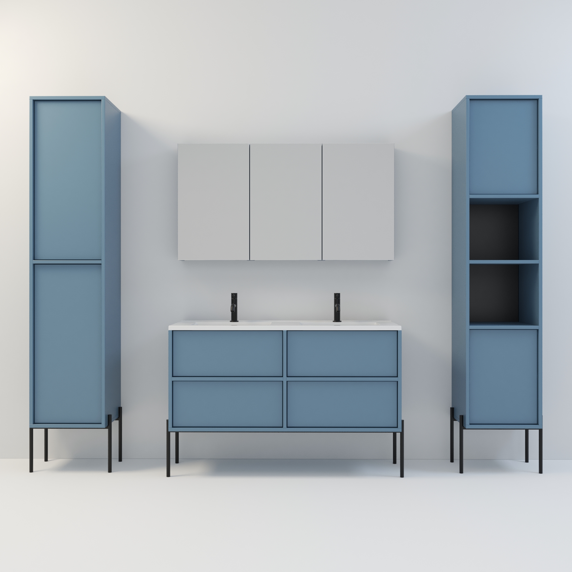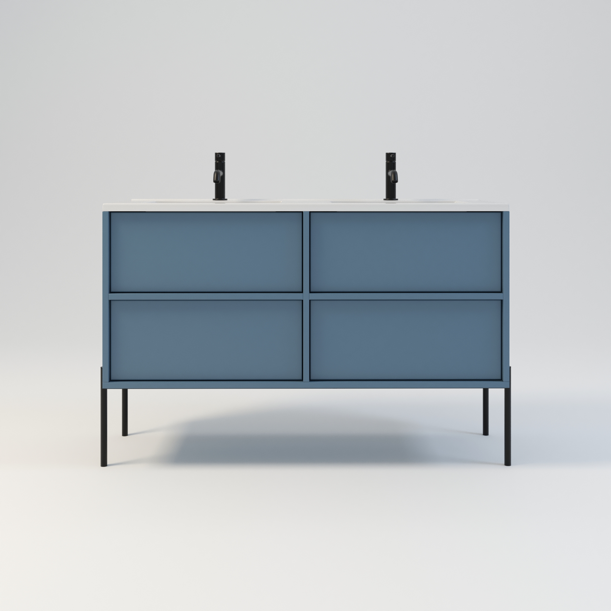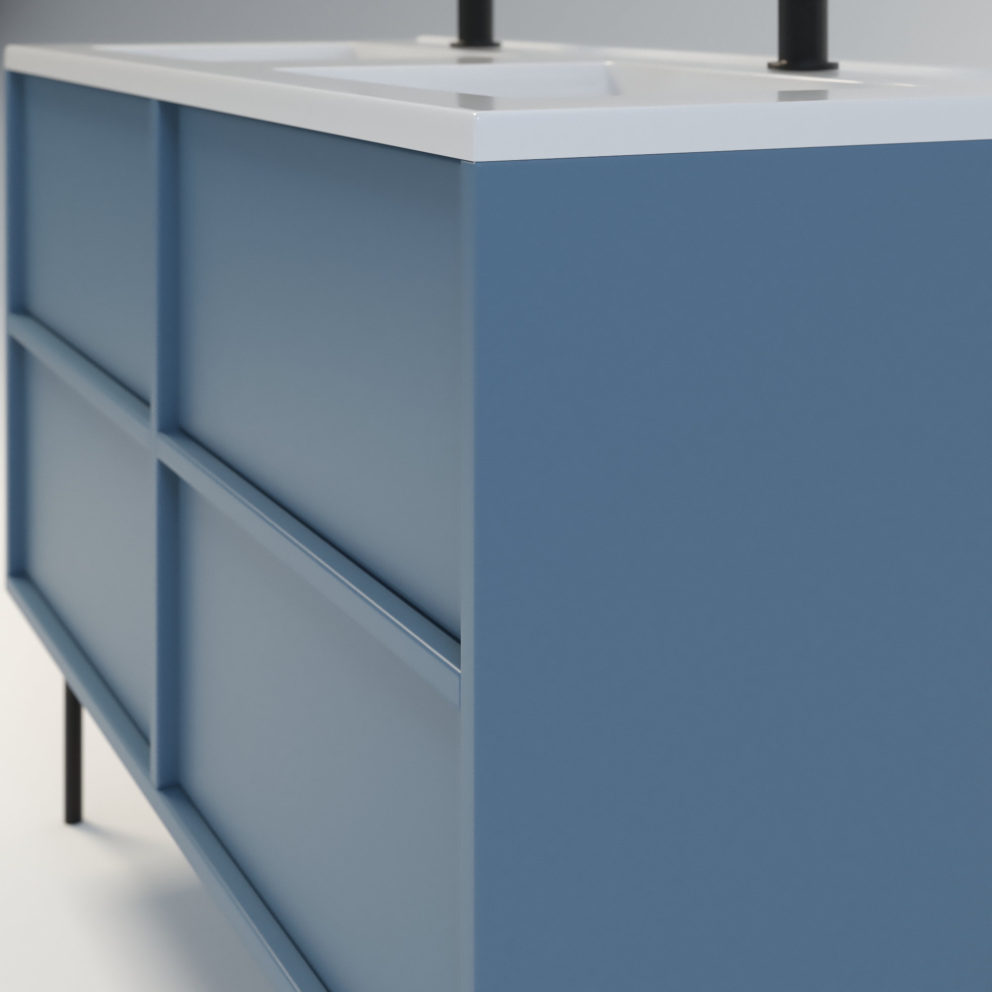 Szafka Minimal 4 z umywalką została zaprojektowana z myślą o codziennym komforcie i maksymalnej funkcjonalności. Wybierając szafkę łazienkową z umywalką pełniącą funkcję blatu, inwestujesz w trwałość, komfort i estetykę. Umywalka pełniąca funkcję blatu pozwala wygodnie korzystać z przestrzeni, jednocześnie chroniąc mebel przed zachlapaniami. Szafkę wykonano z trwałej płyty laminowanej, która charakteryzuje się odpornością na uszkodzenia. Co istotne, cztery pojemne szuflady umożliwiają wygodne przechowywanie akcesoriów – od kosmetyków po ręczniki. Szuflady otwierają się lekko dzięki systemowi „push to open” z synchronizatorami, które zapewniają płynne działanie. W wersji z uchwytami zastosowano prowadnice z cichym domykiem, co wpływa na komfort użytkowania. Co istotne, każda prowadnica została wyposażona w mechanizm 3D, który umożliwia regulację frontów w trzech płaszczyznach. Szerokość szafki razem z nogami metalowymi wynosi 124 cm. Wysokość korpusu szafki to 54 cm. Wysokość stelaża metalowego / nóg to 26 cm.