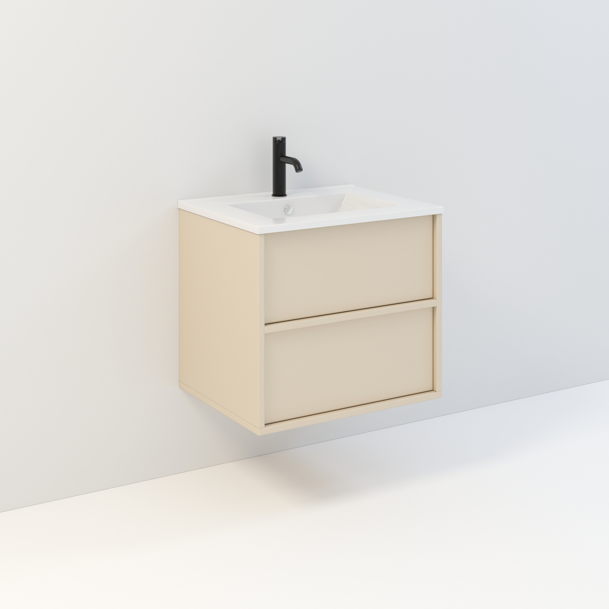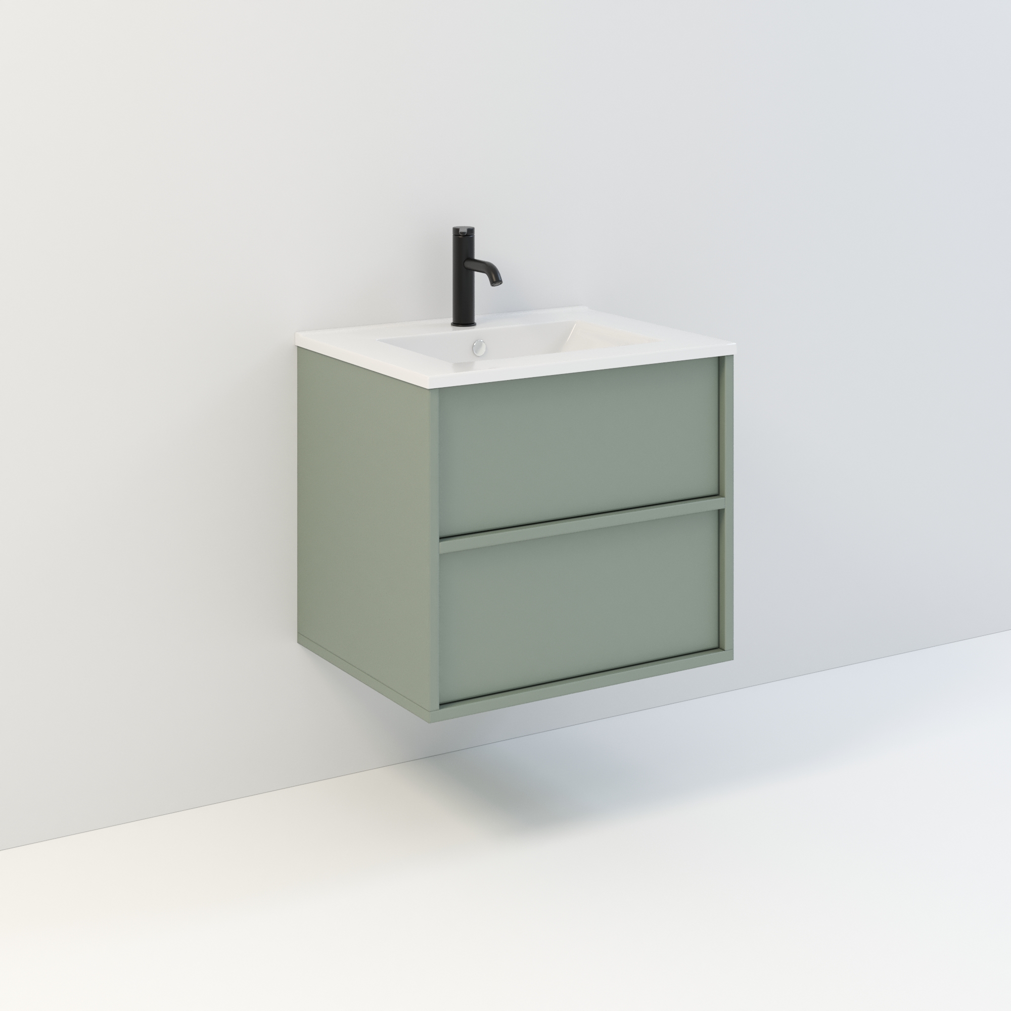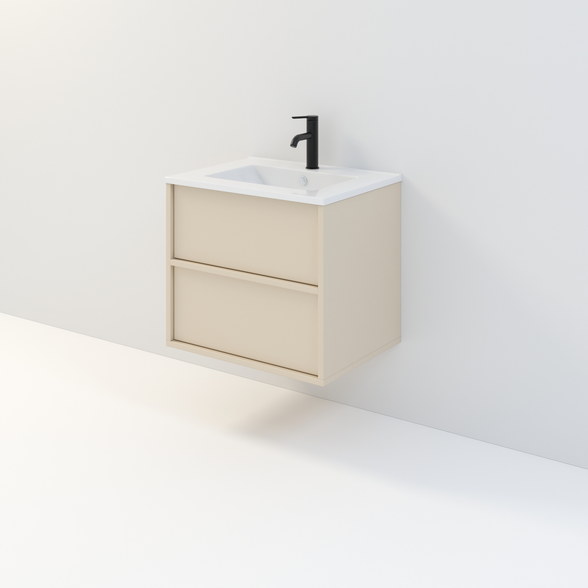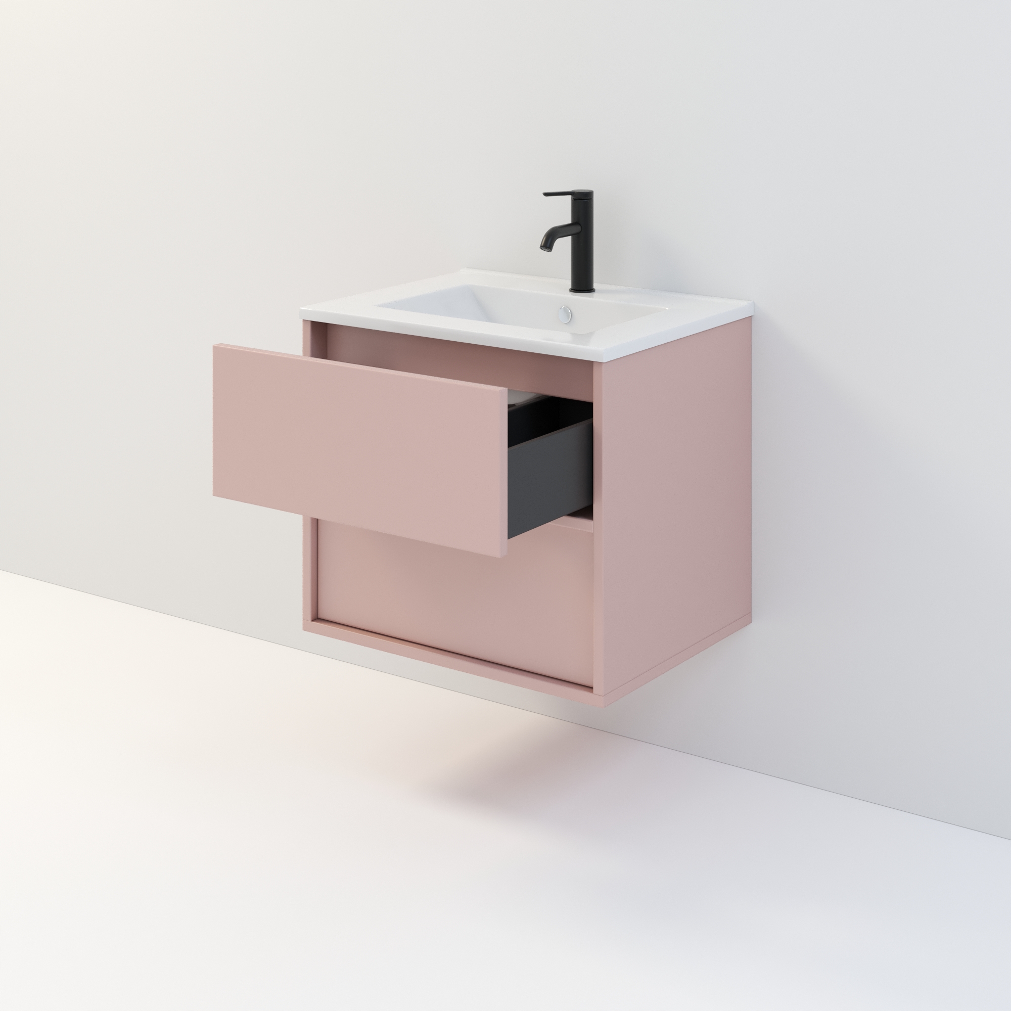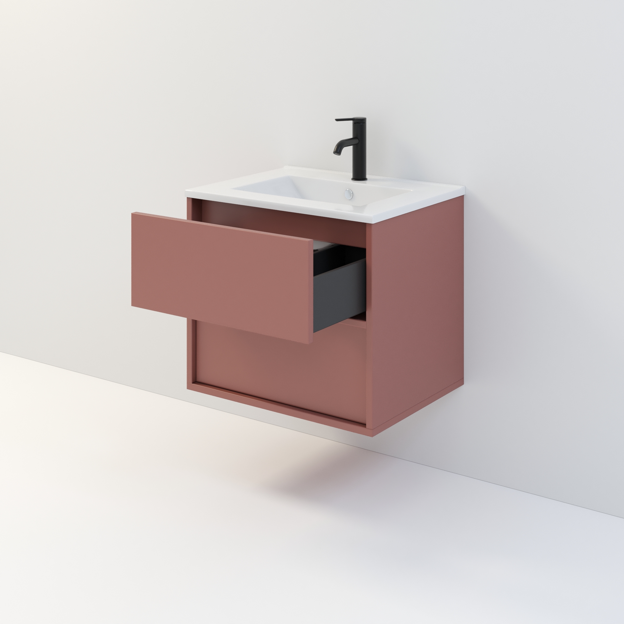 To nowoczesny zestaw łazienkowy który, składa się szafki łazienkowej z dwoma szufladami oraz umywalki ceramicznej pełniącej jednocześnie funkcję blatu. Komplet ten jest niezwykle funkcjonalnym i trwałym rozwiązaniem. Jego minimalistyczna forma sprawia że zestaw idealnie wpasuje się w gusta osób, które cenią prostotę i elegancję. Połączenie uniwersalnego stylu z geometryczną formą sprawia, że szafka dobrze komponuje się w różnych aranżacjach. Można ją dopasować zarówno do łazienek nowoczesnych, jak i klasycznych. Dostępność kilku kolorów oraz opcjonalnych uchwytów ułatwia dopasowanie mebla do stylu wnętrza.