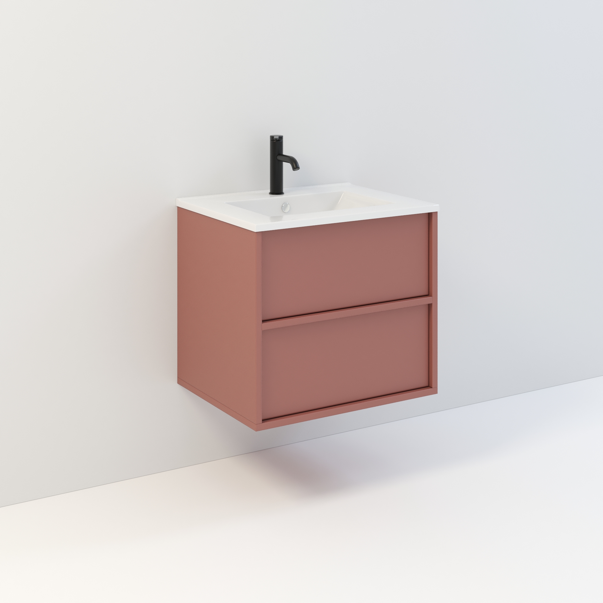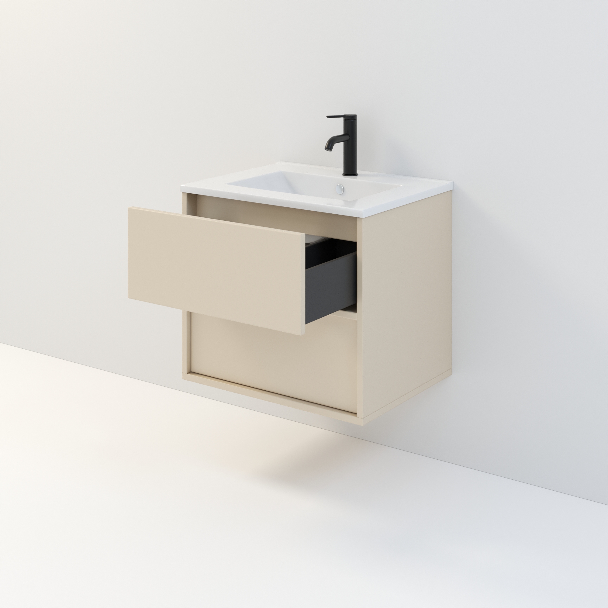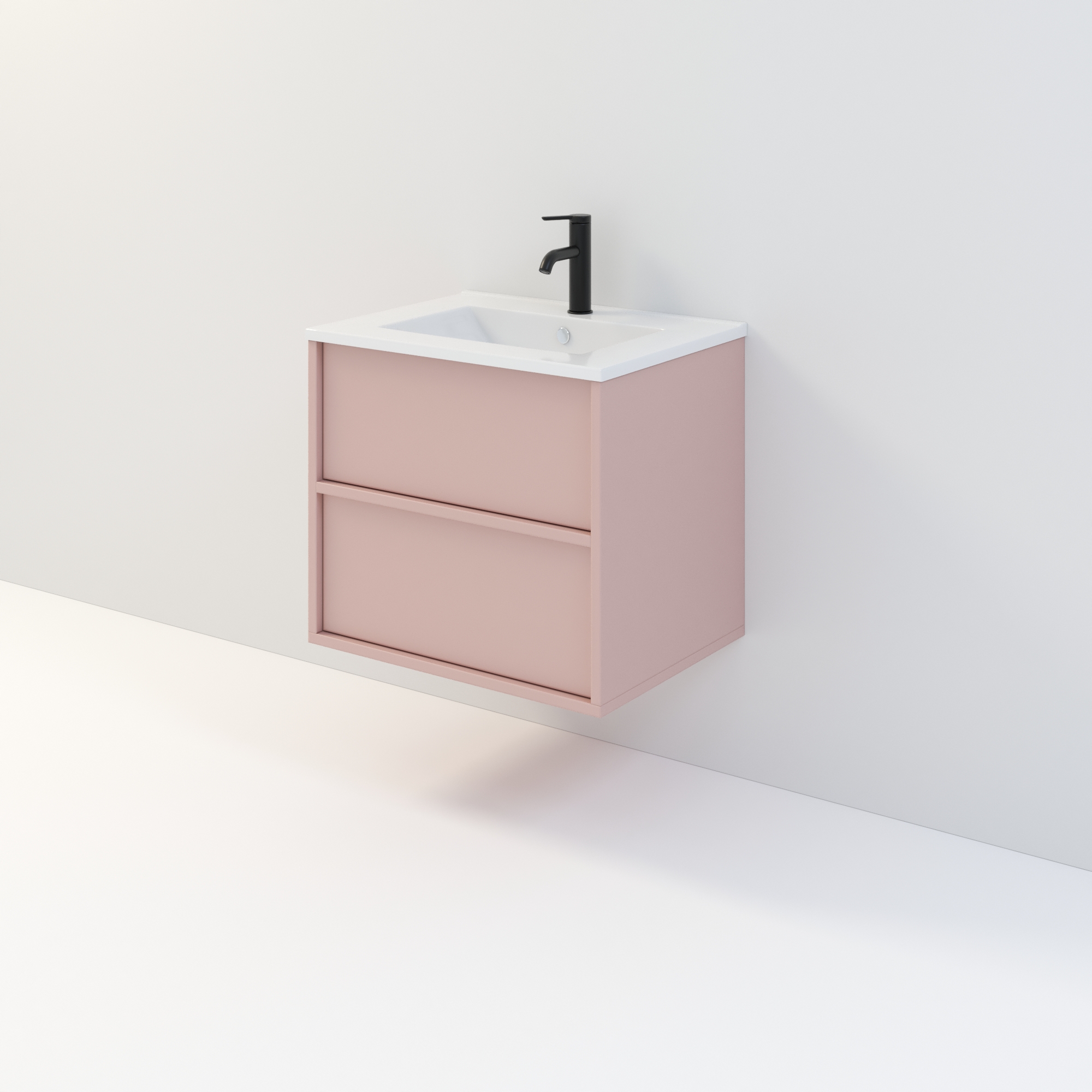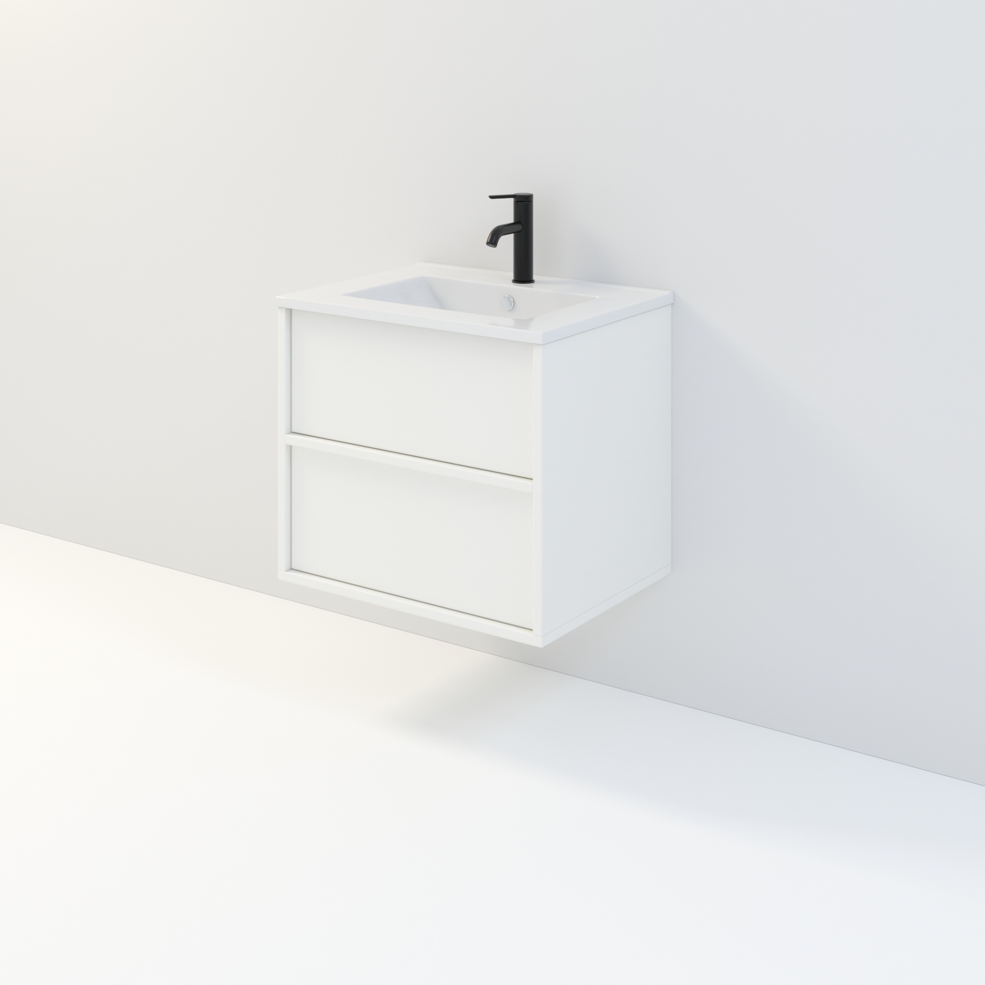 To nowoczesny zestaw łazienkowy który, składa się szafki łazienkowej z dwoma szufladami oraz umywalki ceramicznej pełniącej jednocześnie funkcję blatu. Komplet ten jest niezwykle funkcjonalnym i trwałym rozwiązaniem. Jego minimalistyczna forma sprawia że zestaw idealnie wpasuje się w gusta osób, które cenią prostotę i elegancję. Połączenie uniwersalnego stylu z geometryczną formą sprawia, że szafka dobrze komponuje się w różnych aranżacjach. Można ją dopasować zarówno do łazienek nowoczesnych, jak i klasycznych. Dostępność kilku kolorów oraz opcjonalnych uchwytów ułatwia dopasowanie mebla do stylu wnętrza.