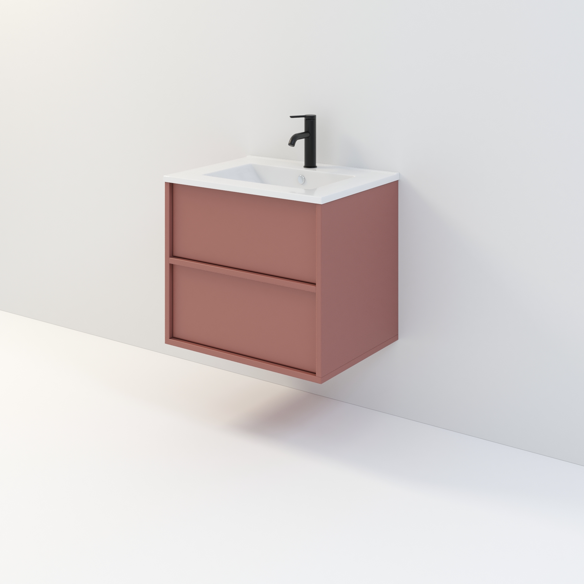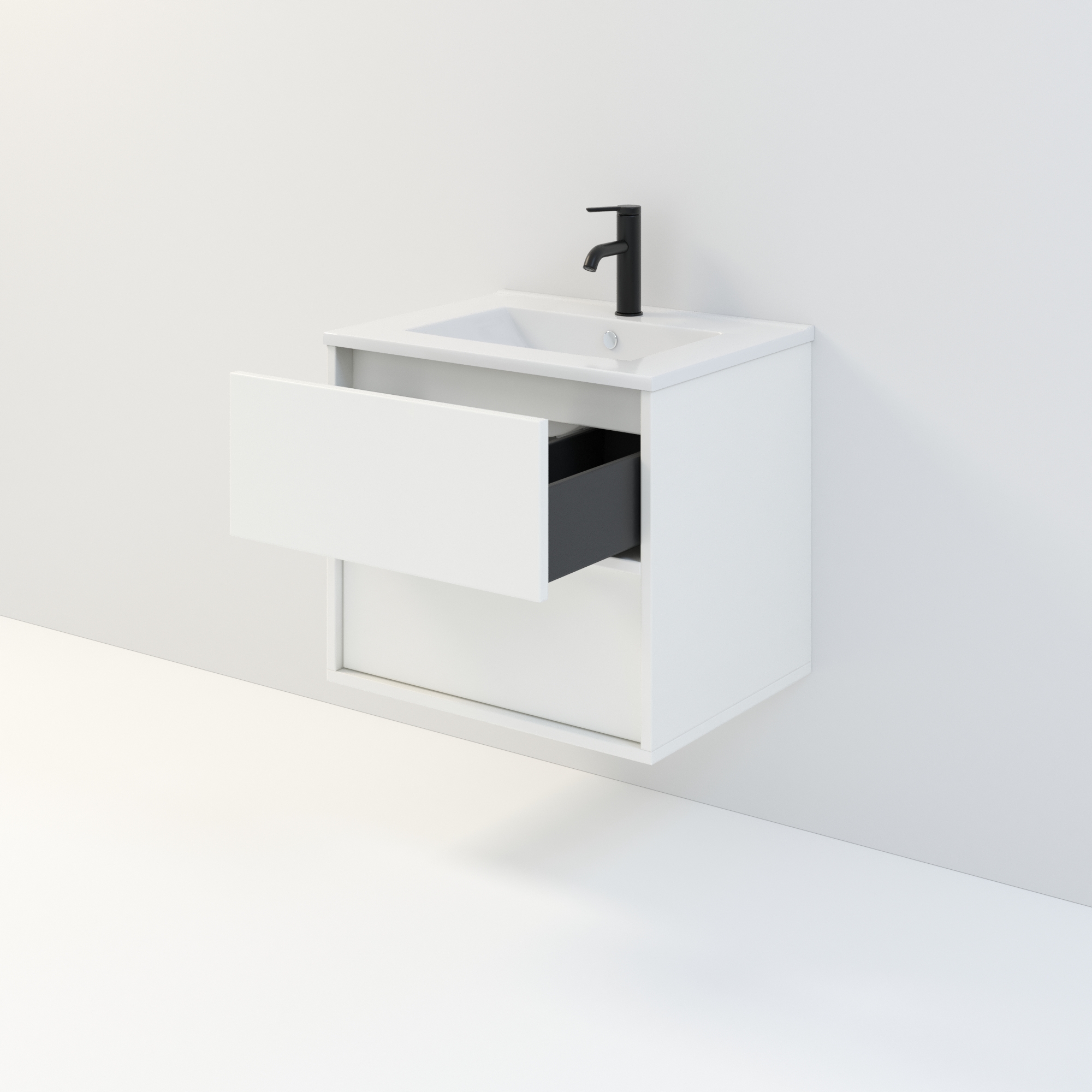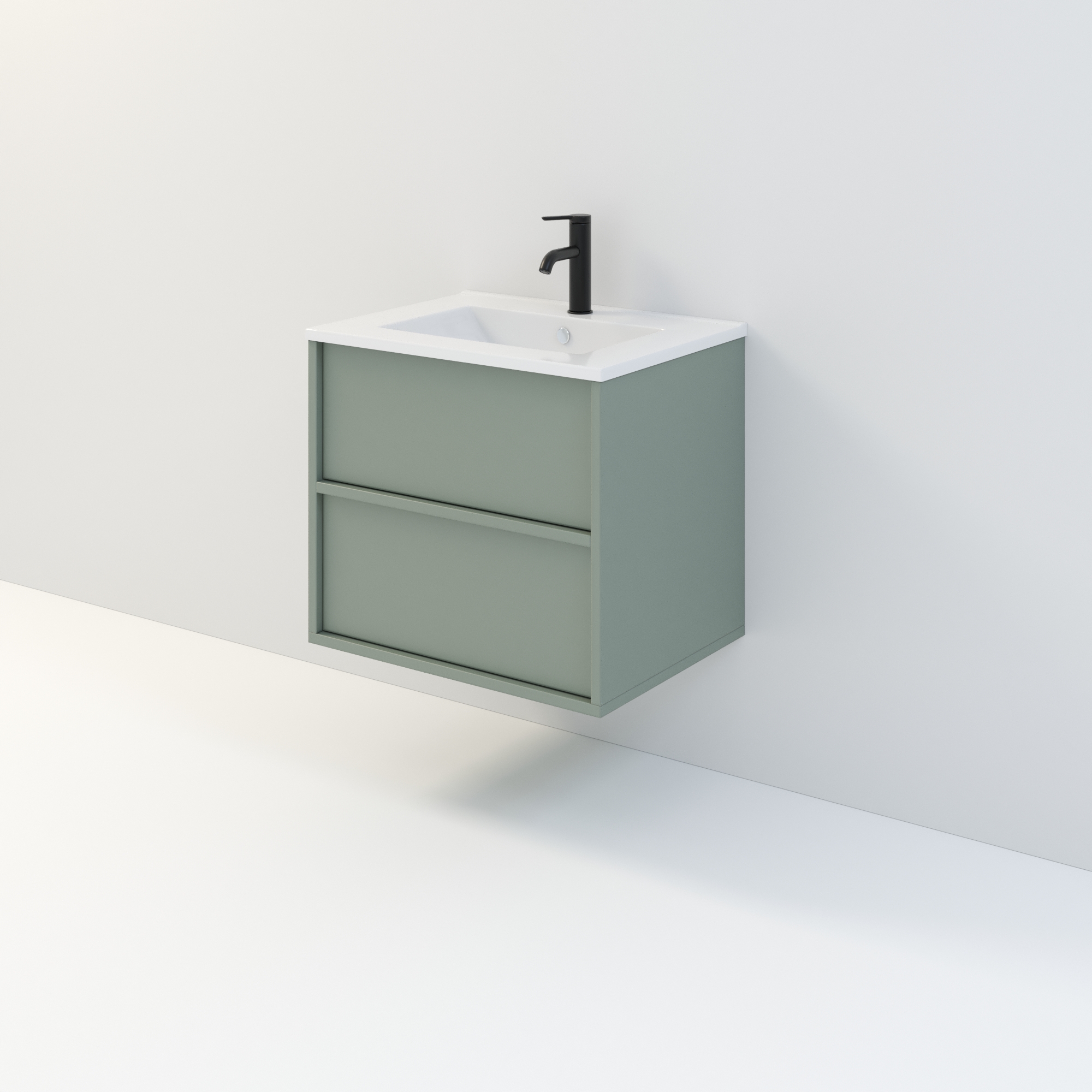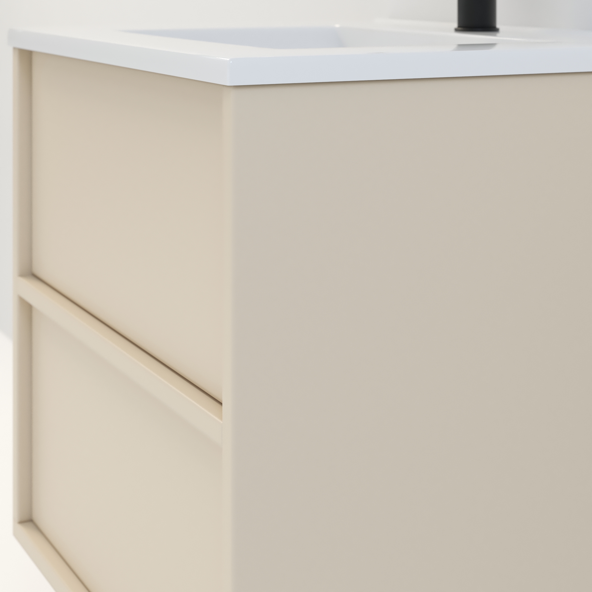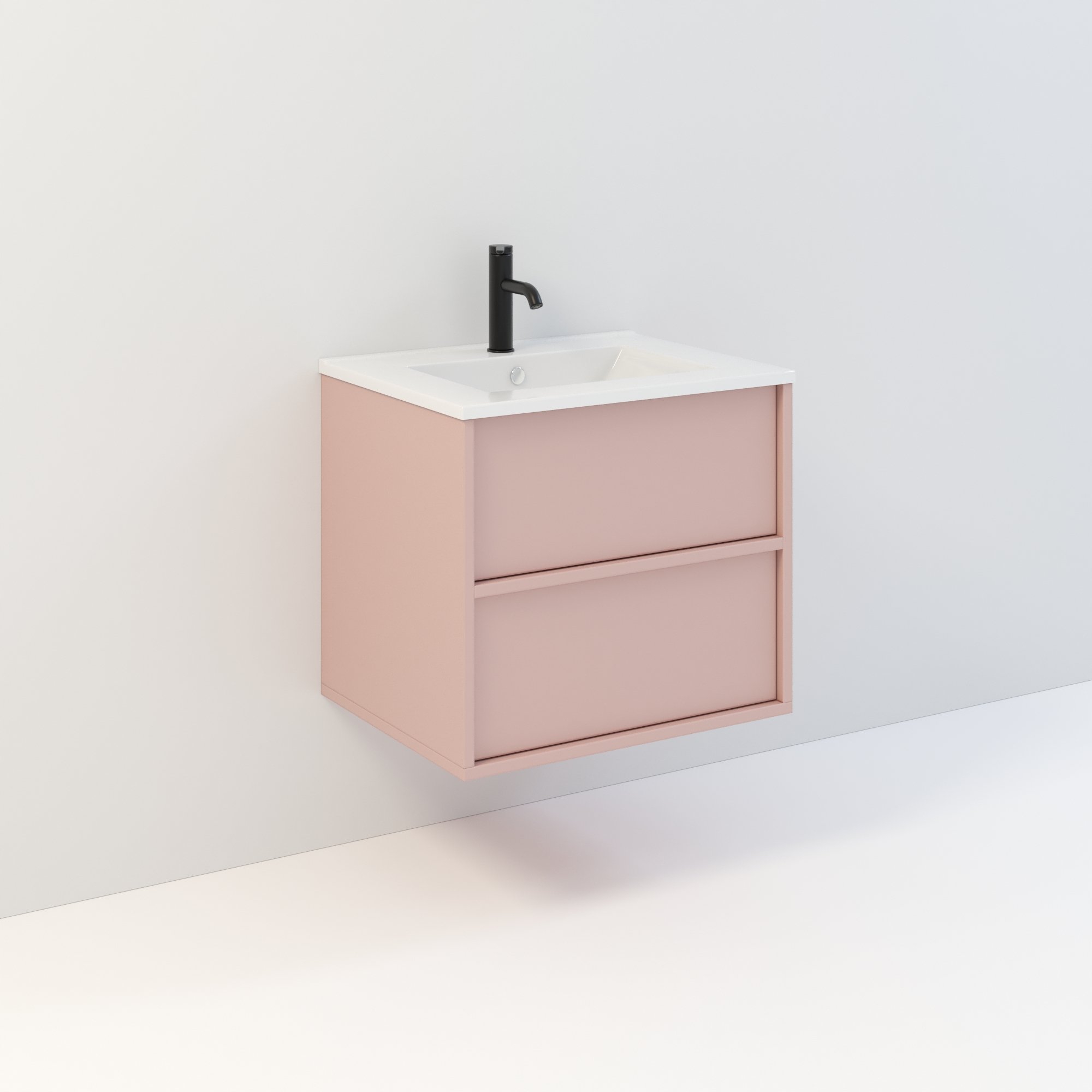 To nowoczesny zestaw łazienkowy który, składa się szafki łazienkowej z dwoma szufladami oraz umywalki ceramicznej pełniącej jednocześnie funkcję blatu. Komplet ten jest niezwykle funkcjonalnym i trwałym rozwiązaniem. Jego minimalistyczna forma sprawia że zestaw idealnie wpasuje się w gusta osób, które cenią prostotę i elegancję. Połączenie uniwersalnego stylu z geometryczną formą sprawia, że szafka dobrze komponuje się w różnych aranżacjach. Można ją dopasować zarówno do łazienek nowoczesnych, jak i klasycznych. Dostępność kilku kolorów oraz opcjonalnych uchwytów ułatwia dopasowanie mebla do stylu wnętrza.