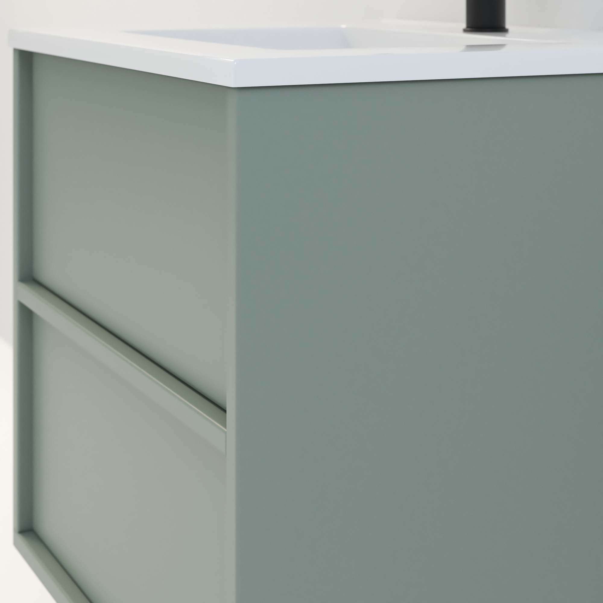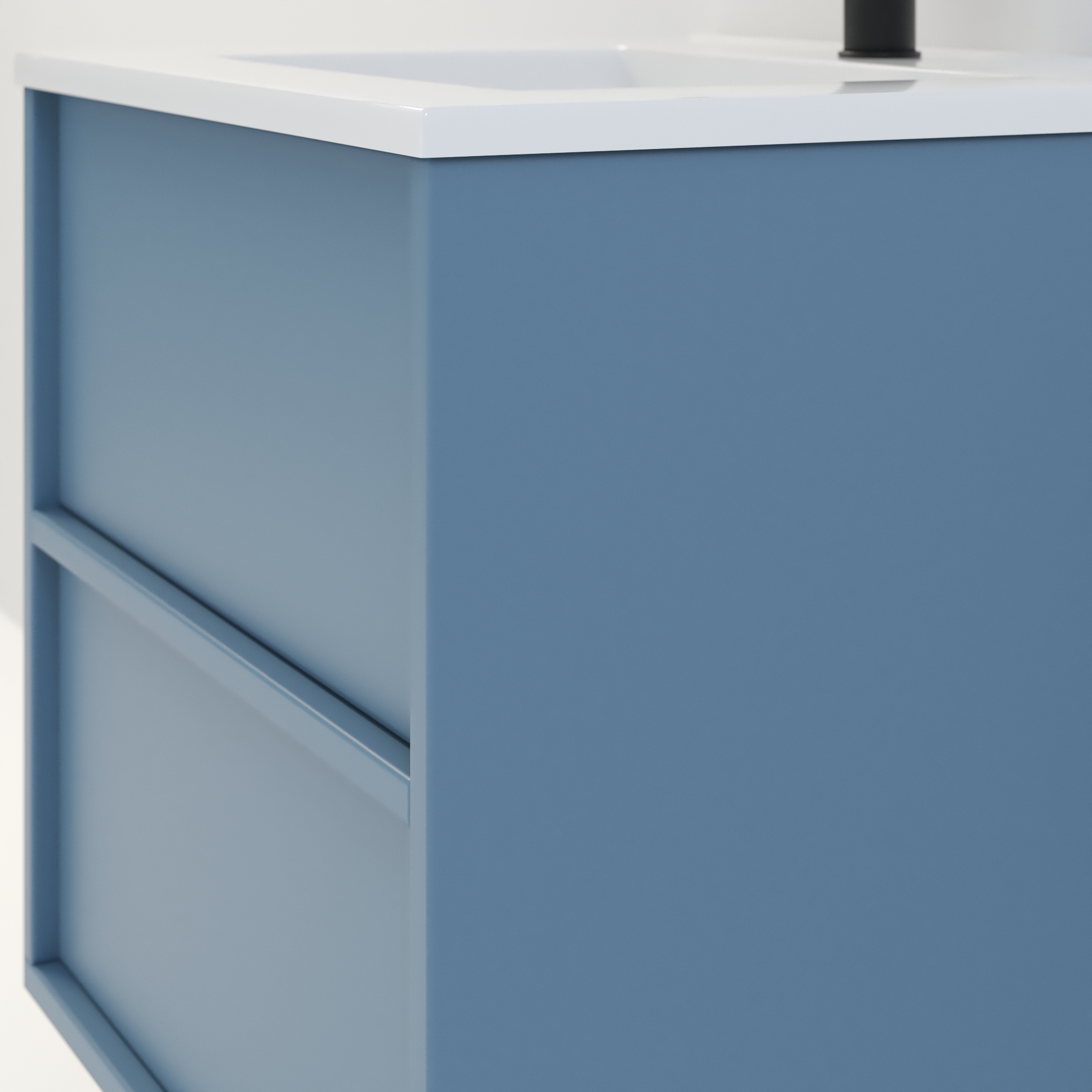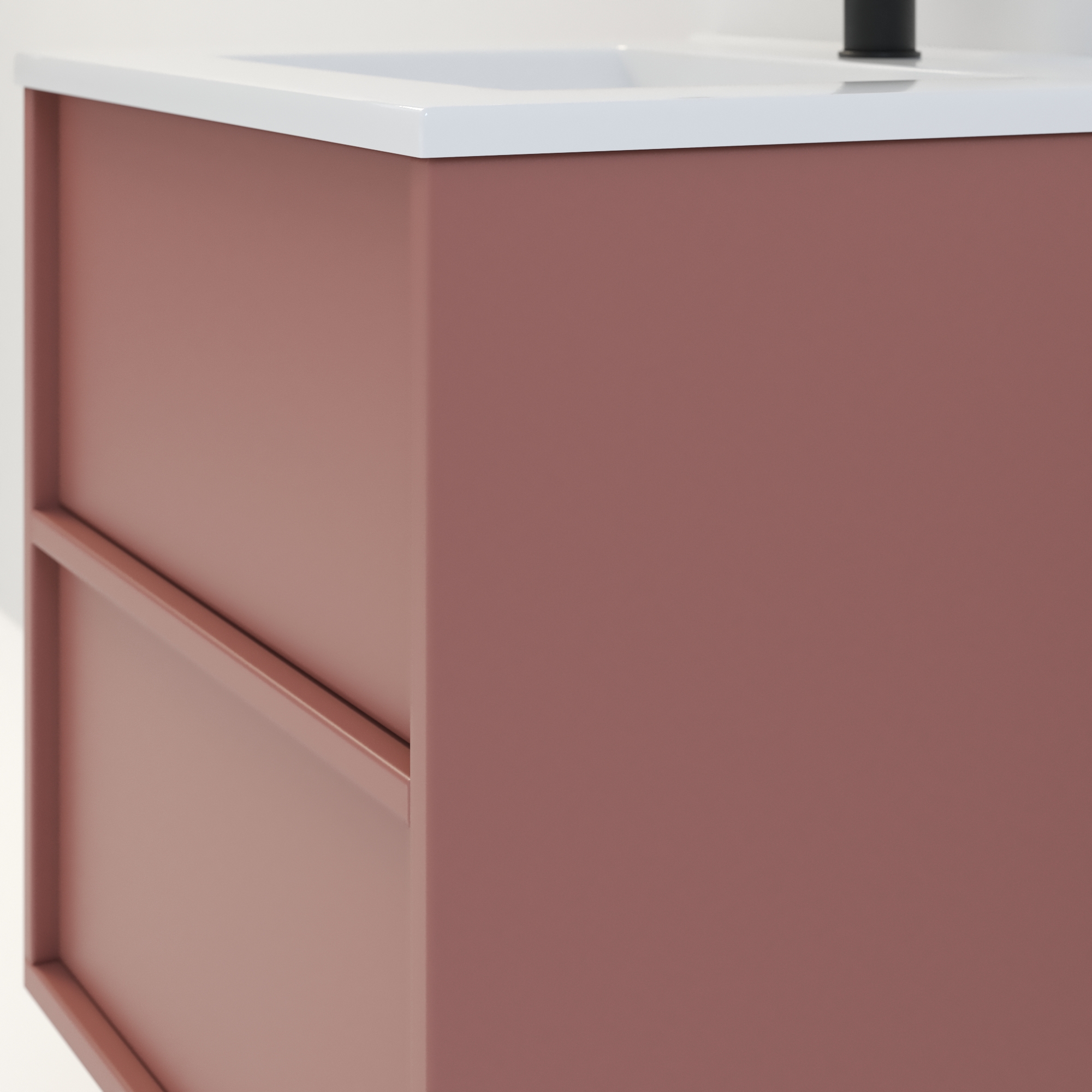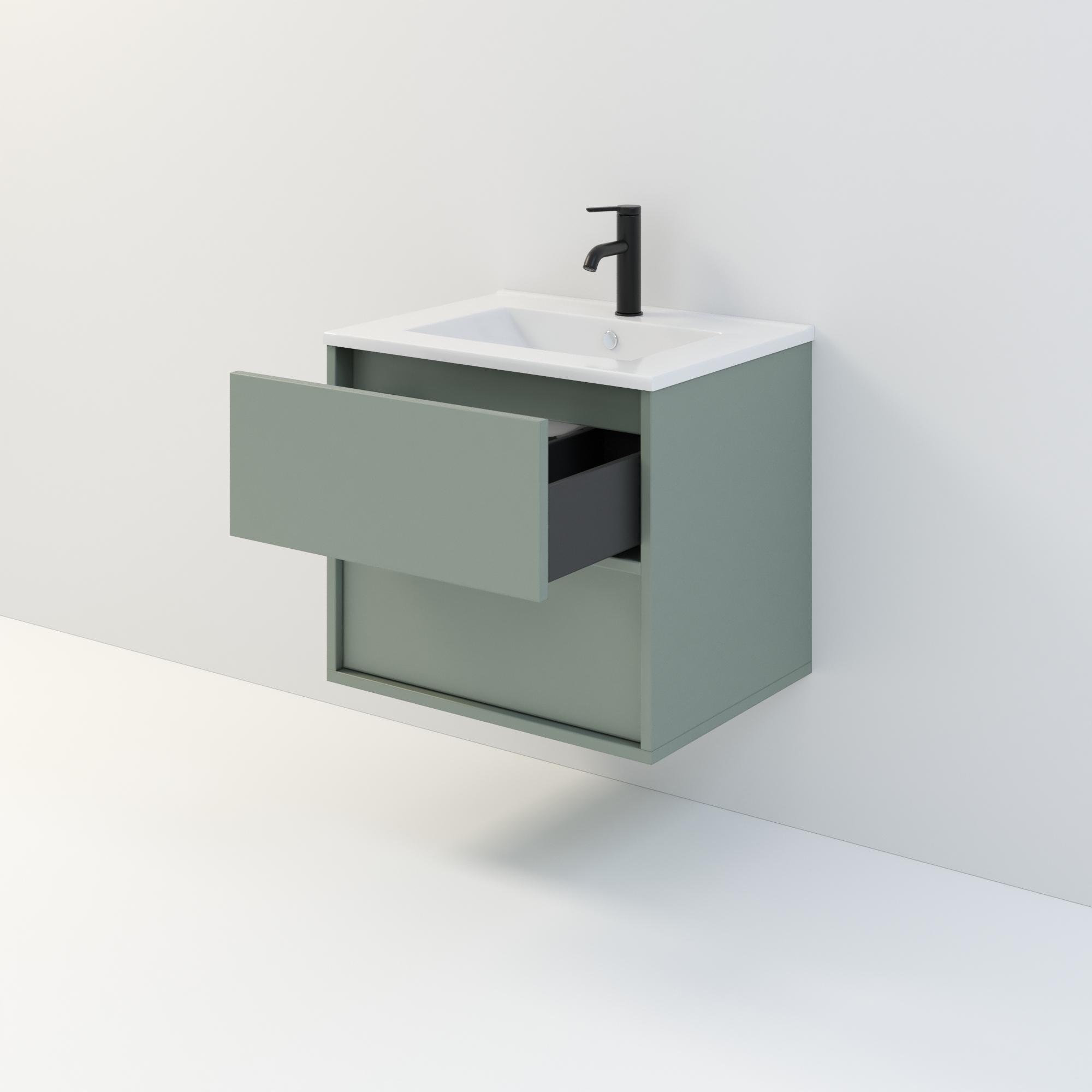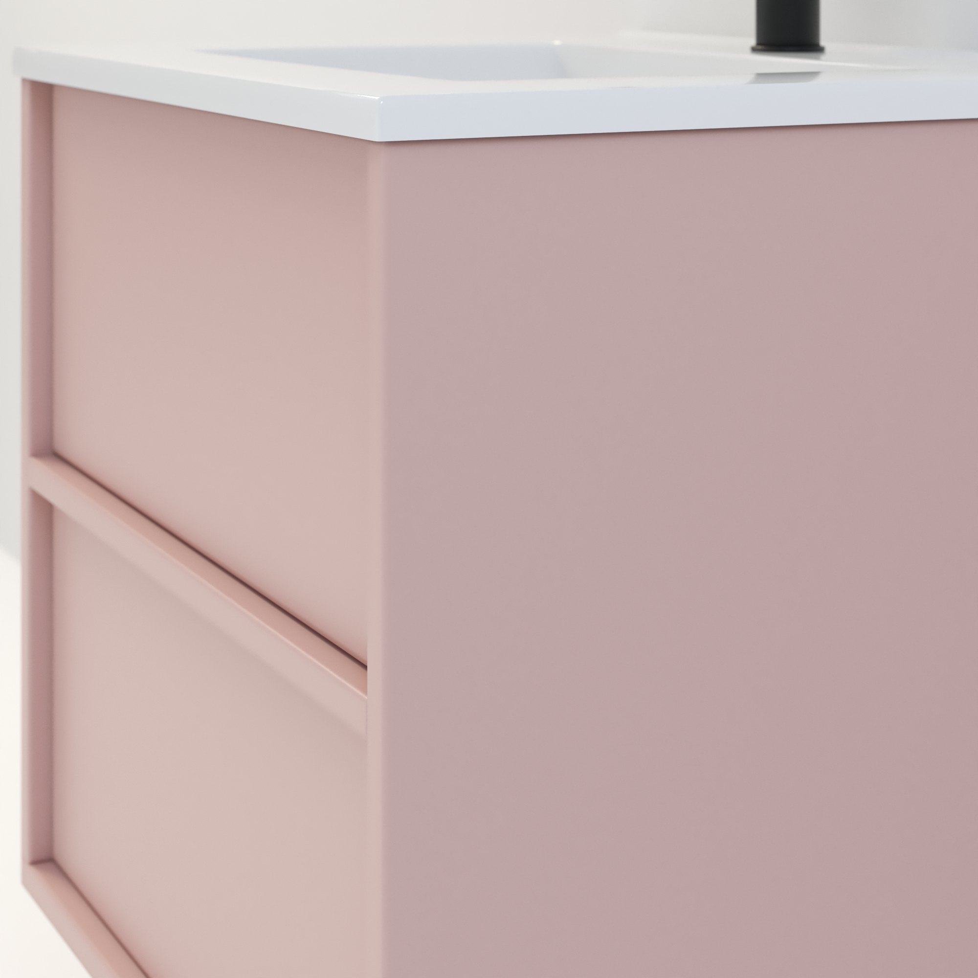 To nowoczesny zestaw łazienkowy który, składa się szafki łazienkowej z dwoma szufladami oraz umywalki ceramicznej pełniącej jednocześnie funkcję blatu. Komplet ten jest niezwykle funkcjonalnym i trwałym rozwiązaniem. Jego minimalistyczna forma sprawia że zestaw idealnie wpasuje się w gusta osób, które cenią prostotę i elegancję. Połączenie uniwersalnego stylu z geometryczną formą sprawia, że szafka dobrze komponuje się w różnych aranżacjach. Można ją dopasować zarówno do łazienek nowoczesnych, jak i klasycznych. Dostępność kilku kolorów oraz opcjonalnych uchwytów ułatwia dopasowanie mebla do stylu wnętrza.
