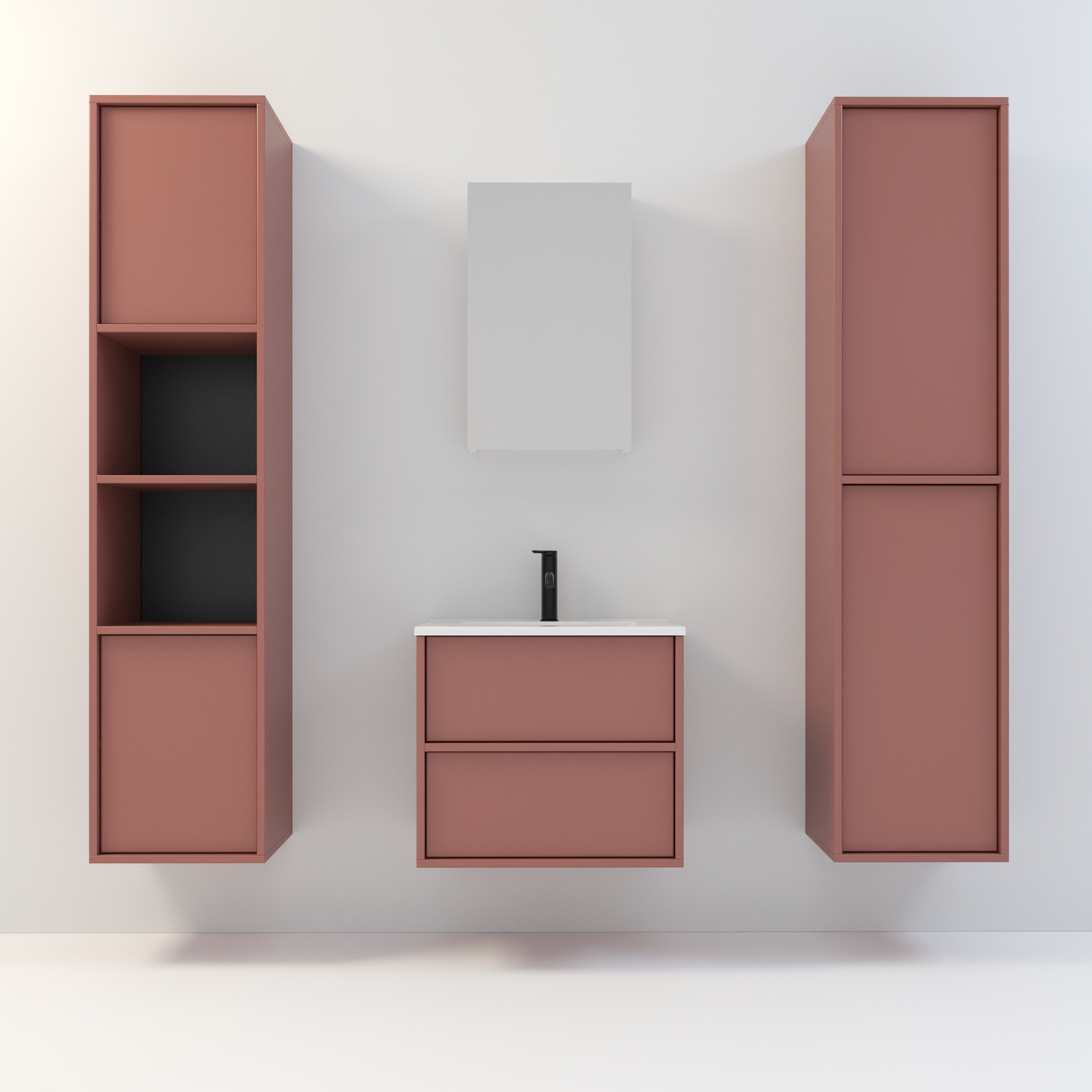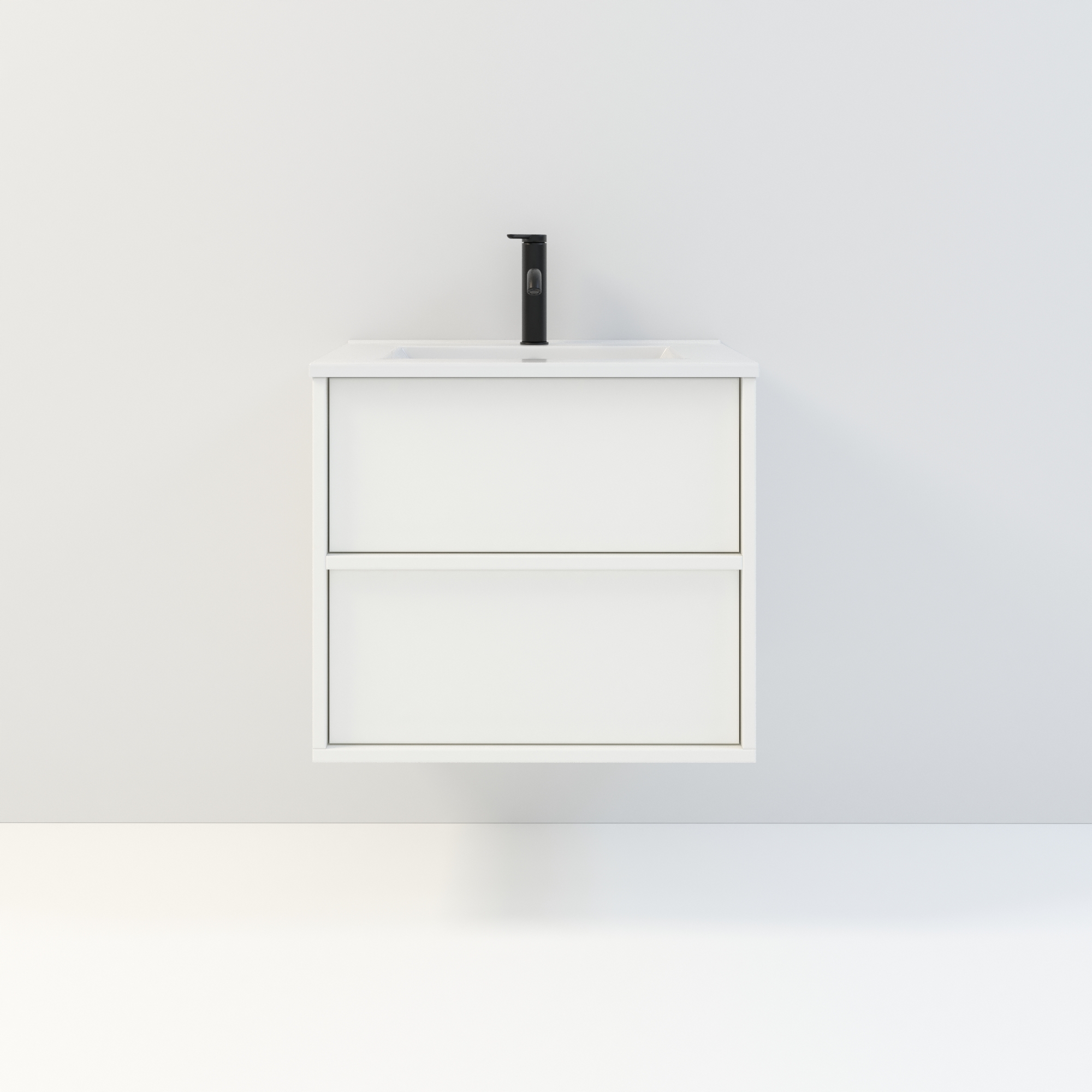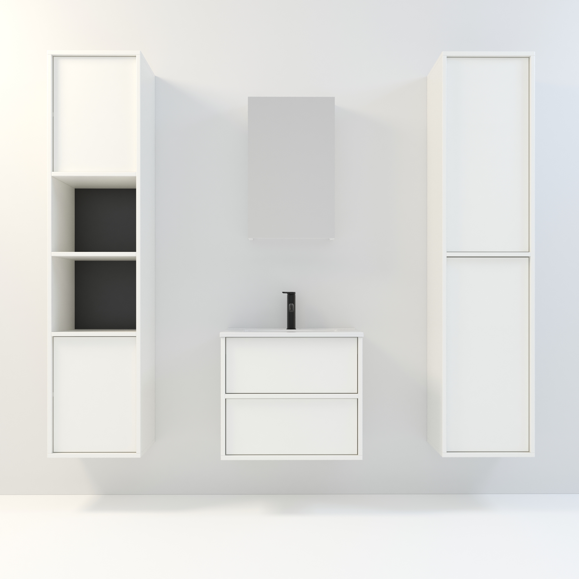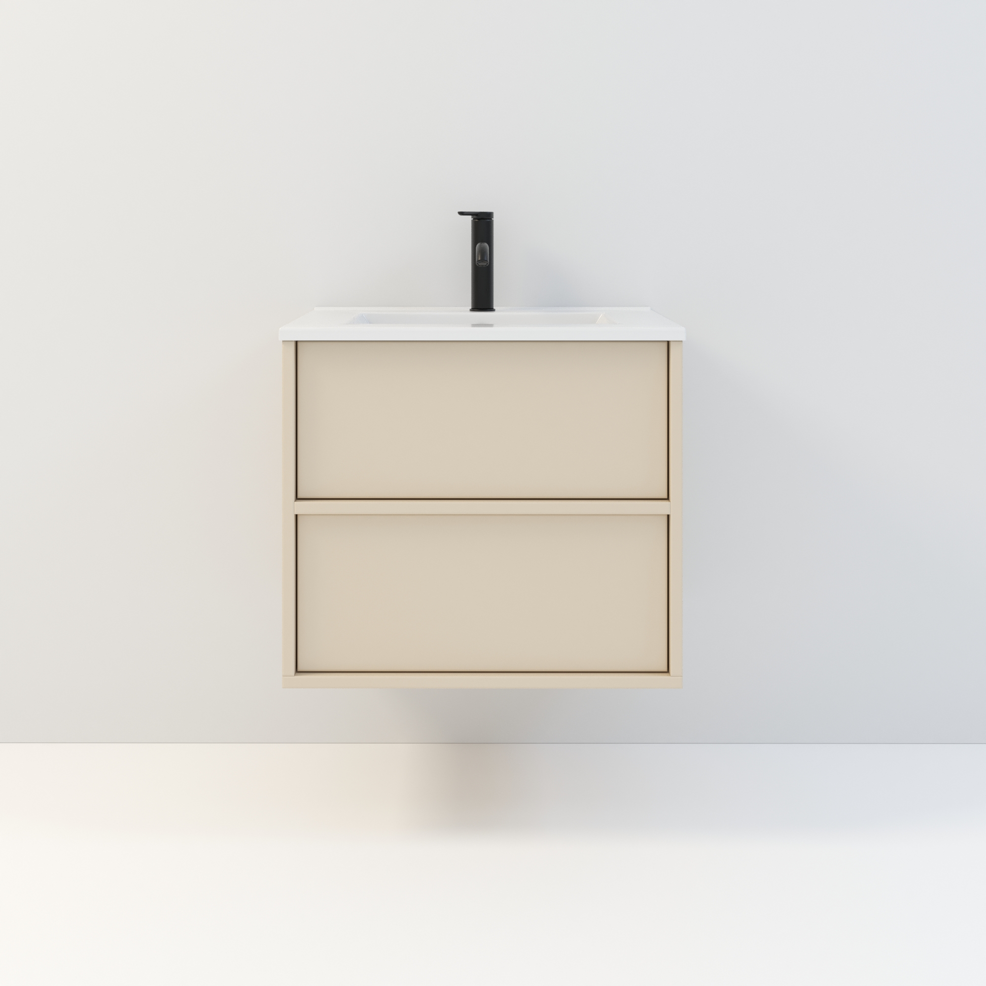 To nowoczesny zestaw łazienkowy który, składa się szafki łazienkowej z dwoma szufladami oraz umywalki ceramicznej pełniącej jednocześnie funkcję blatu. Komplet ten jest niezwykle funkcjonalnym i trwałym rozwiązaniem. Jego minimalistyczna forma sprawia że zestaw idealnie wpasuje się w gusta osób, które cenią prostotę i elegancję. Połączenie uniwersalnego stylu z geometryczną formą sprawia, że szafka dobrze komponuje się w różnych aranżacjach. Można ją dopasować zarówno do łazienek nowoczesnych, jak i klasycznych. Dostępność kilku kolorów oraz opcjonalnych uchwytów ułatwia dopasowanie mebla do stylu wnętrza.