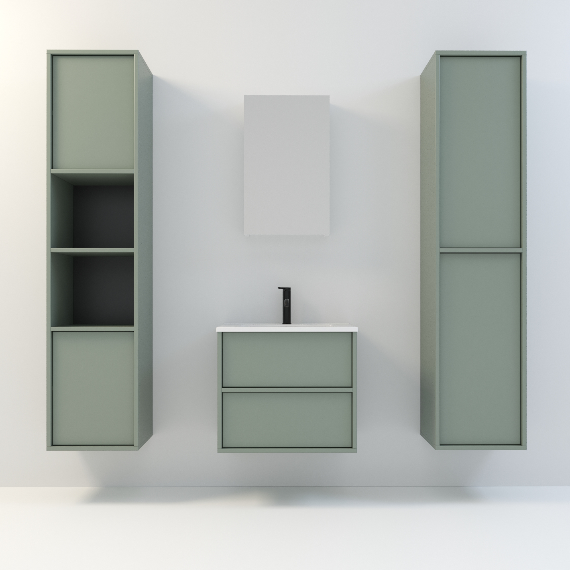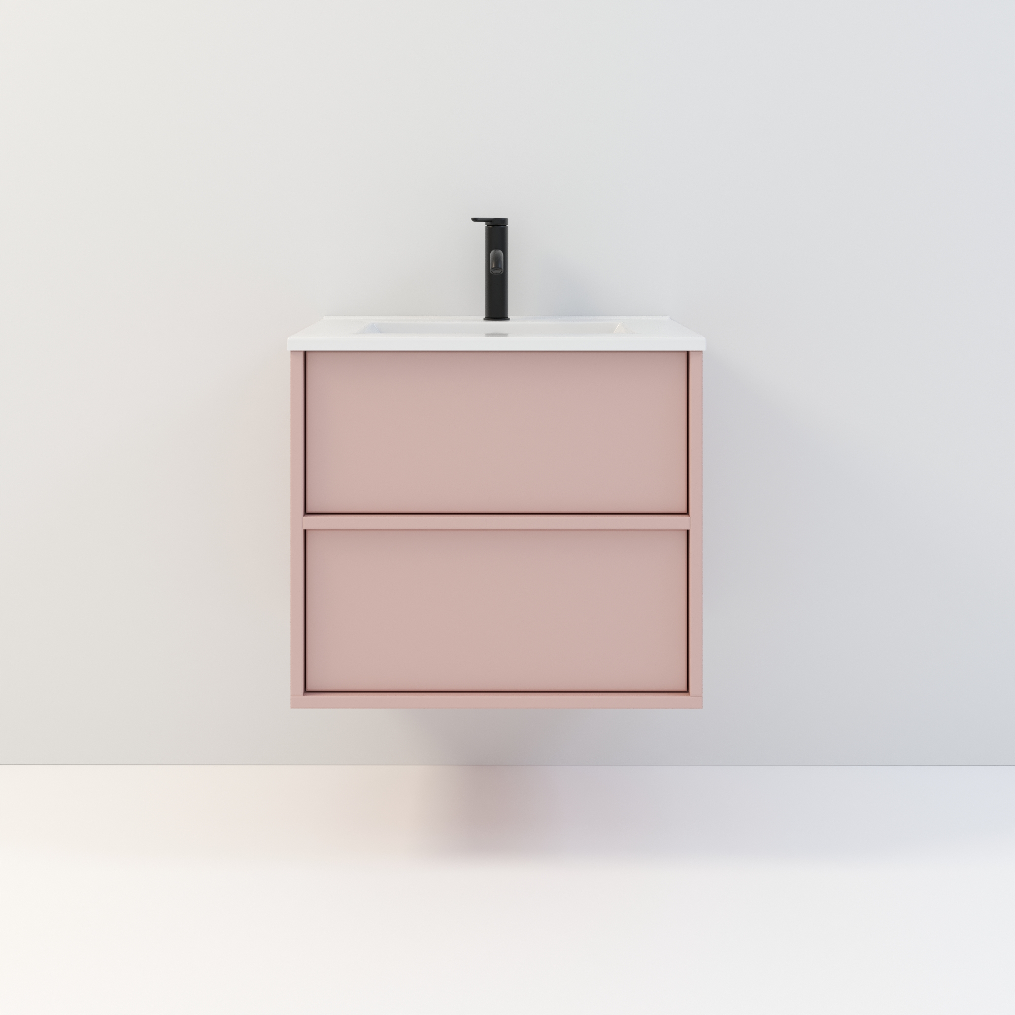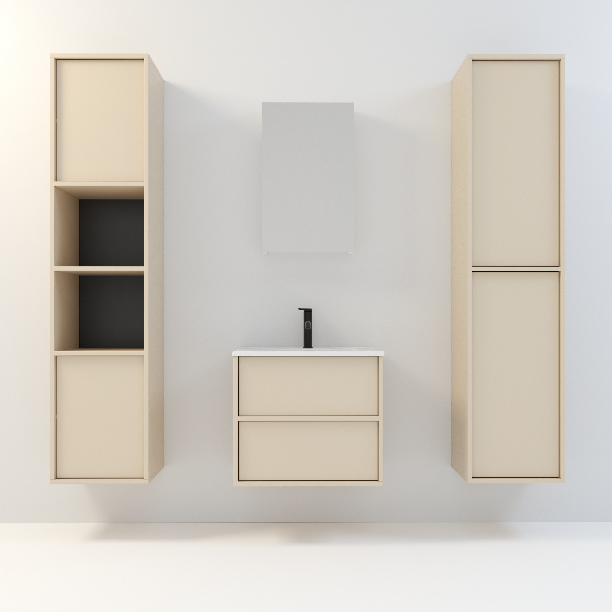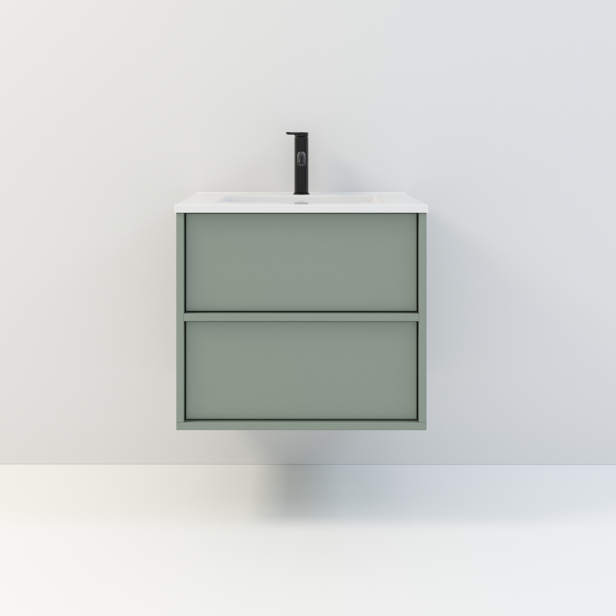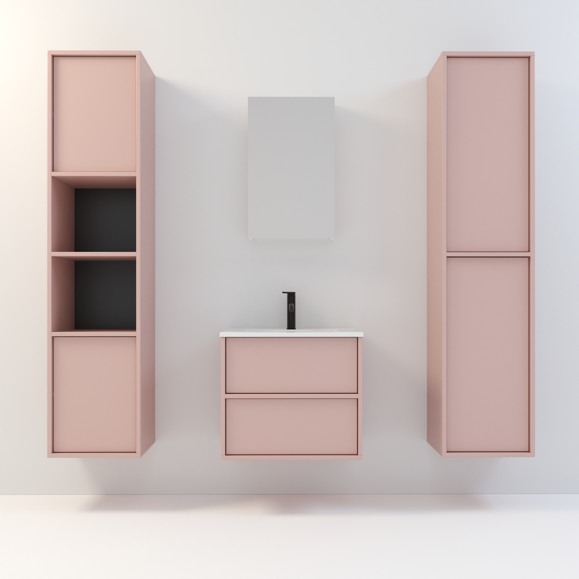 To nowoczesny zestaw łazienkowy który, składa się szafki łazienkowej z dwoma szufladami oraz umywalki ceramicznej pełniącej jednocześnie funkcję blatu. Komplet ten jest niezwykle funkcjonalnym i trwałym rozwiązaniem. Jego minimalistyczna forma sprawia że zestaw idealnie wpasuje się w gusta osób, które cenią prostotę i elegancję. Połączenie uniwersalnego stylu z geometryczną formą sprawia, że szafka dobrze komponuje się w różnych aranżacjach. Można ją dopasować zarówno do łazienek nowoczesnych, jak i klasycznych. Dostępność kilku kolorów oraz opcjonalnych uchwytów ułatwia dopasowanie mebla do stylu wnętrza.