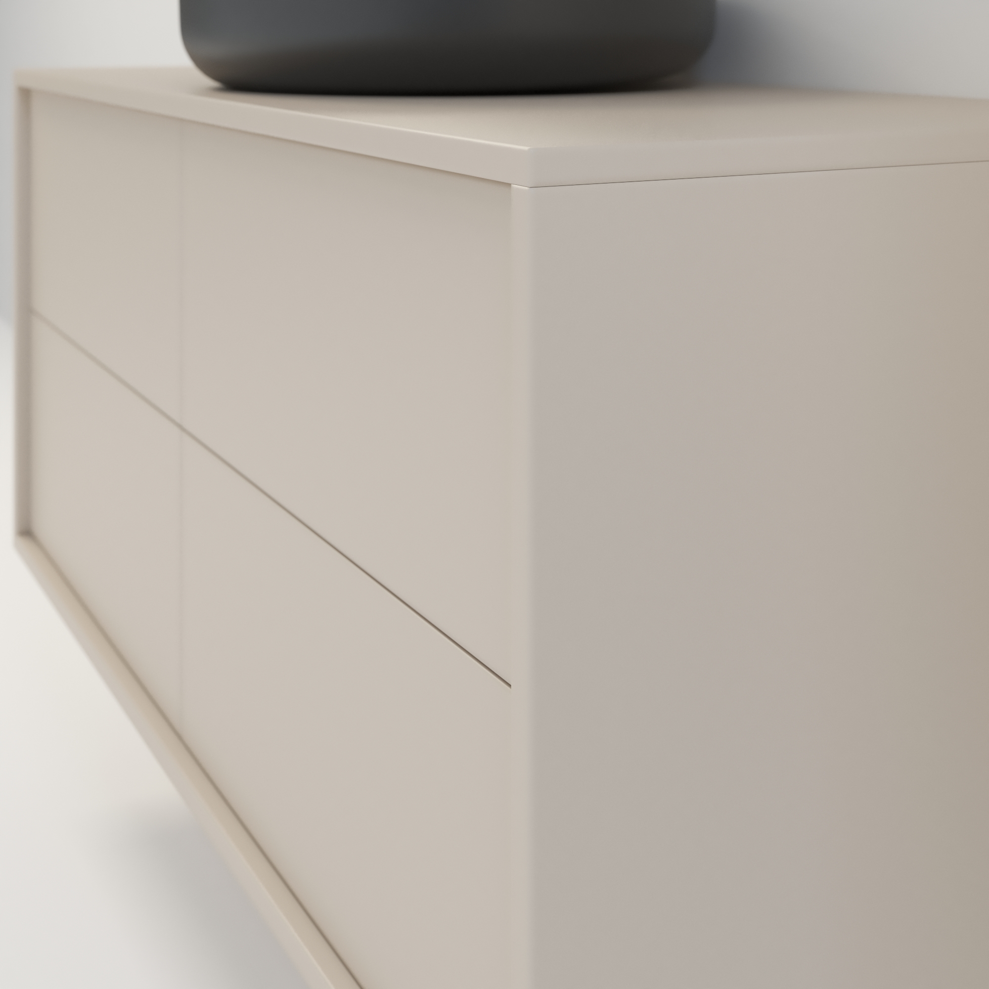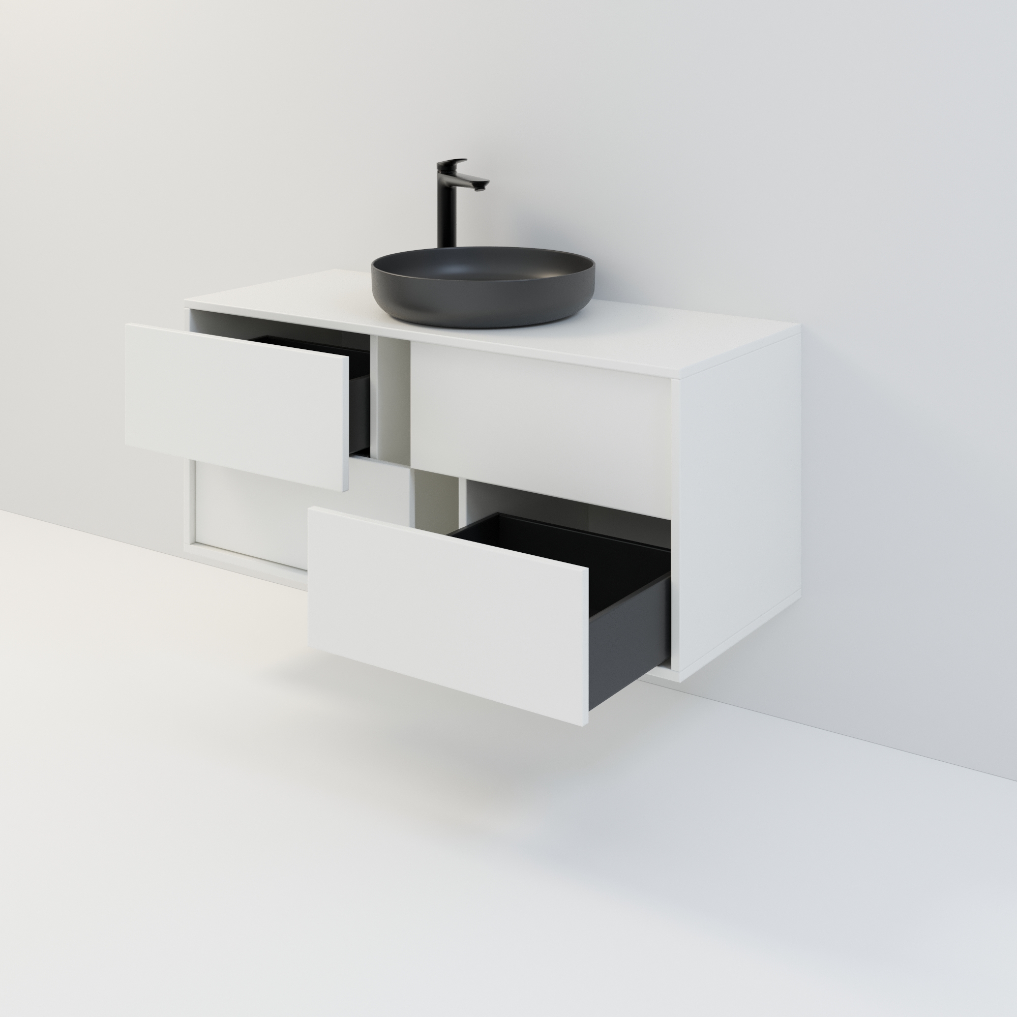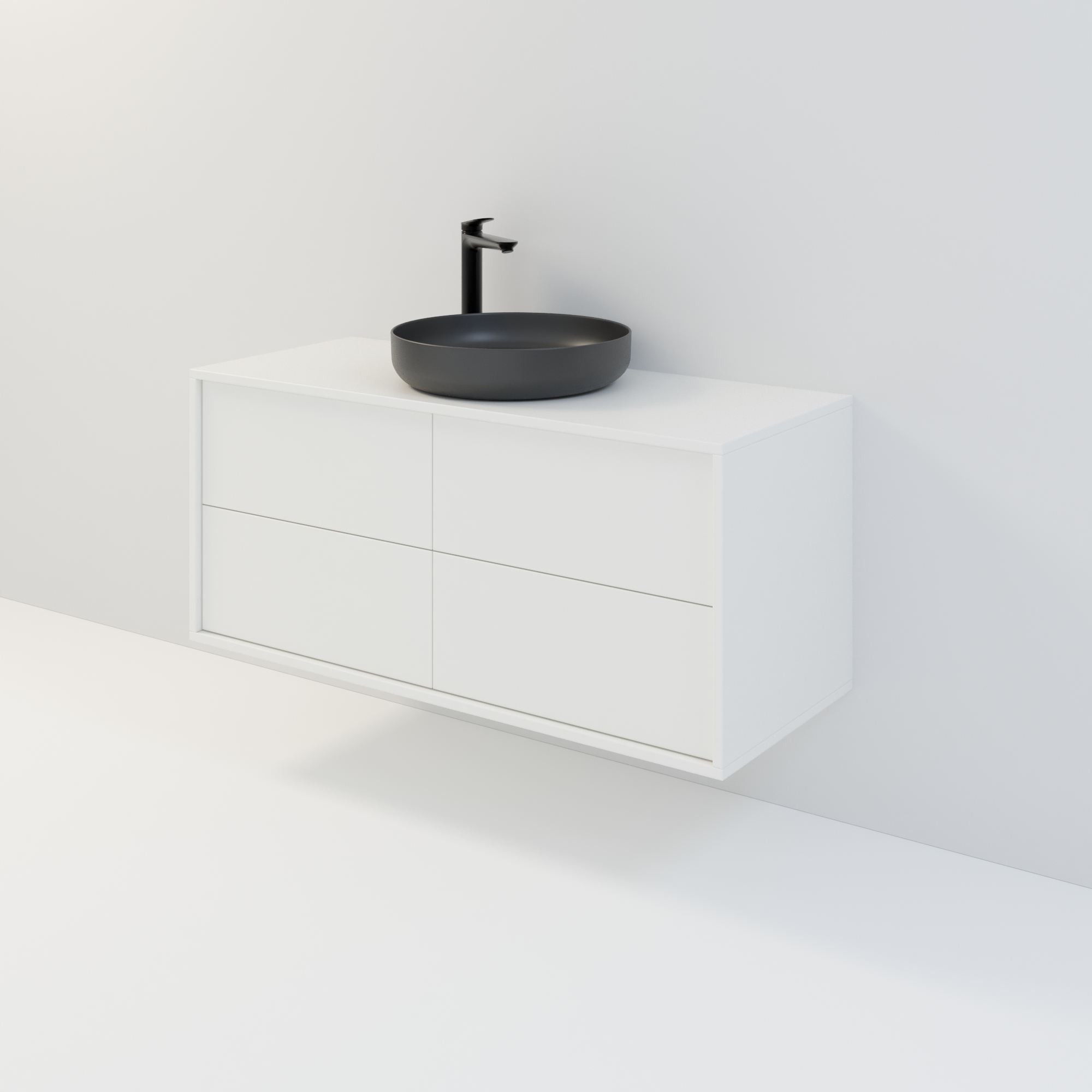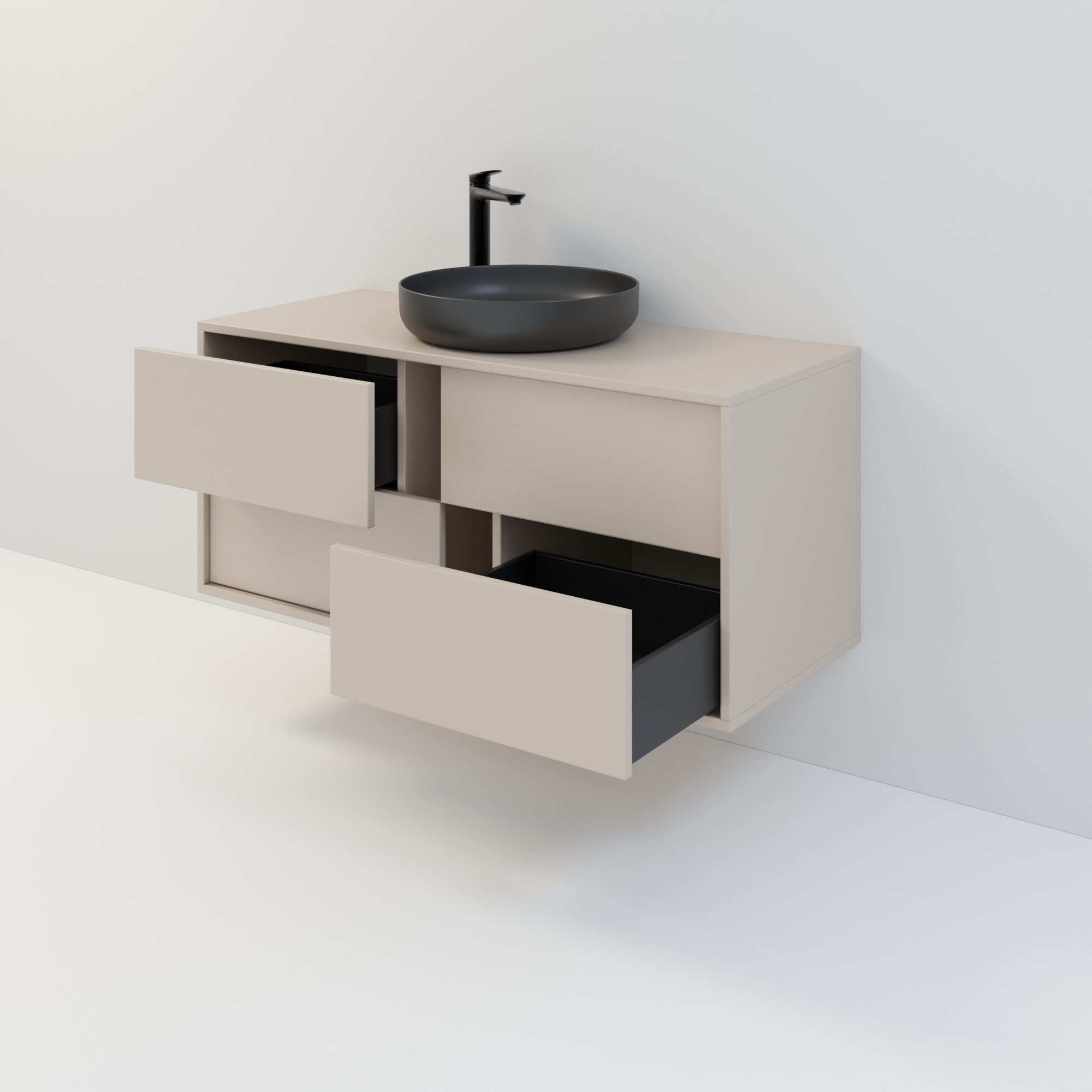 Szafka Minimal 4 UC została zaprojektowana z myślą o codziennym komforcie, dlatego oferuje wiele praktycznych rozwiązań. Wykonano ją z trwałej płyty laminowanej, która charakteryzuje się odpornością na uszkodzenia oraz łatwym utrzymaniem czystości. Co istotne, cztery pojemne szuflady umożliwiają wygodne przechowywanie akcesoriów – od kosmetyków po ręczniki. Szuflady otwierają się lekko dzięki systemowi „push to open” z synchronizatorami, które zapewniają płynne działanie. W wersji z uchwytami zastosowano prowadnice z cichym domykiem, co wpływa na komfort użytkowania. Mechanizm 3D w prowadnicach pozwala precyzyjnie ustawić fronty w trzech płaszczyznach, dlatego szafka zawsze wygląda estetycznie. Szafka jest przeznaczona pod montaż jednej umywalki na środku. Dzięki przemyślanej konstrukcji wszystkie szuflady są pełne i oferują dużą przestrzeń do przechowywania. Umywalka nie wchodzi w skład zestawu.