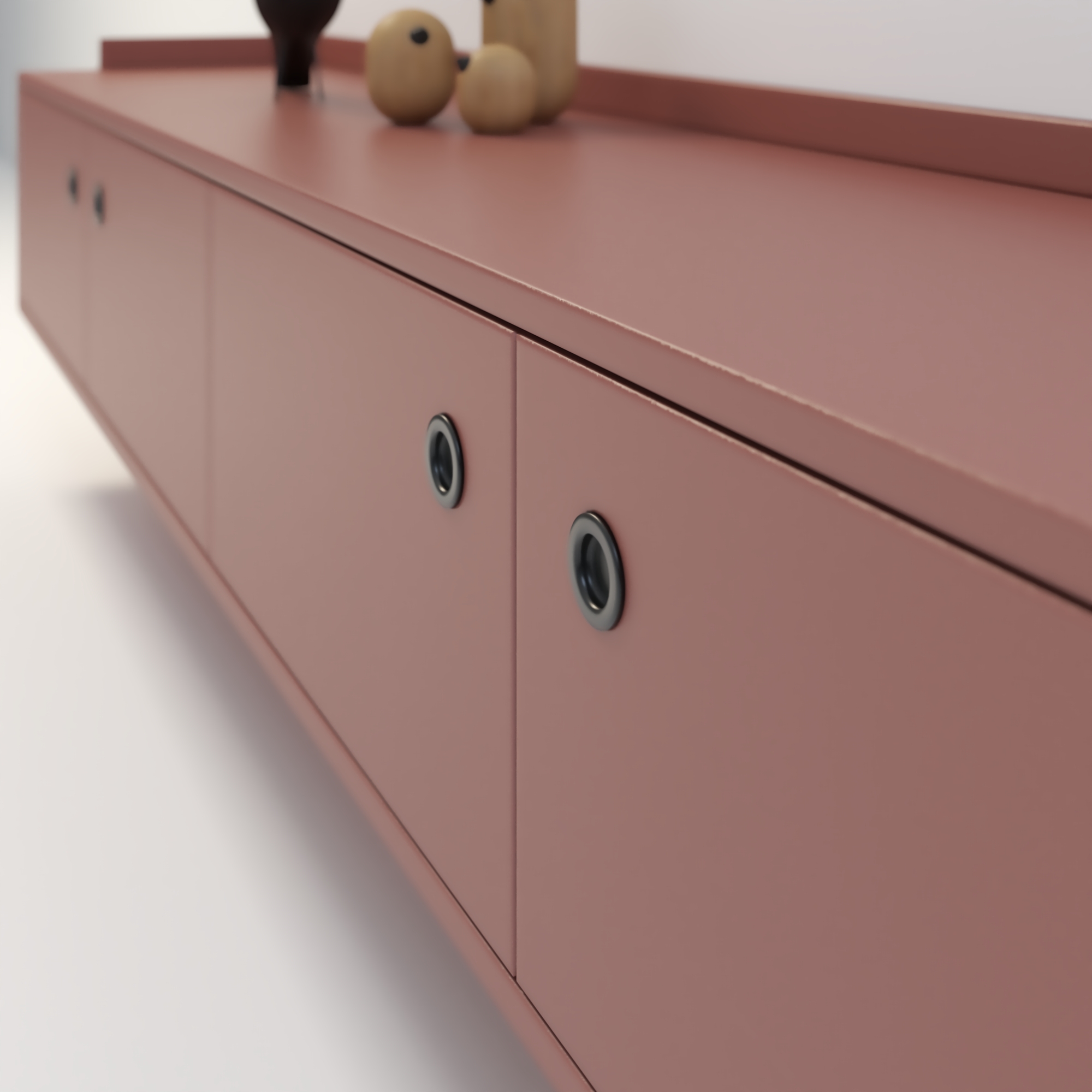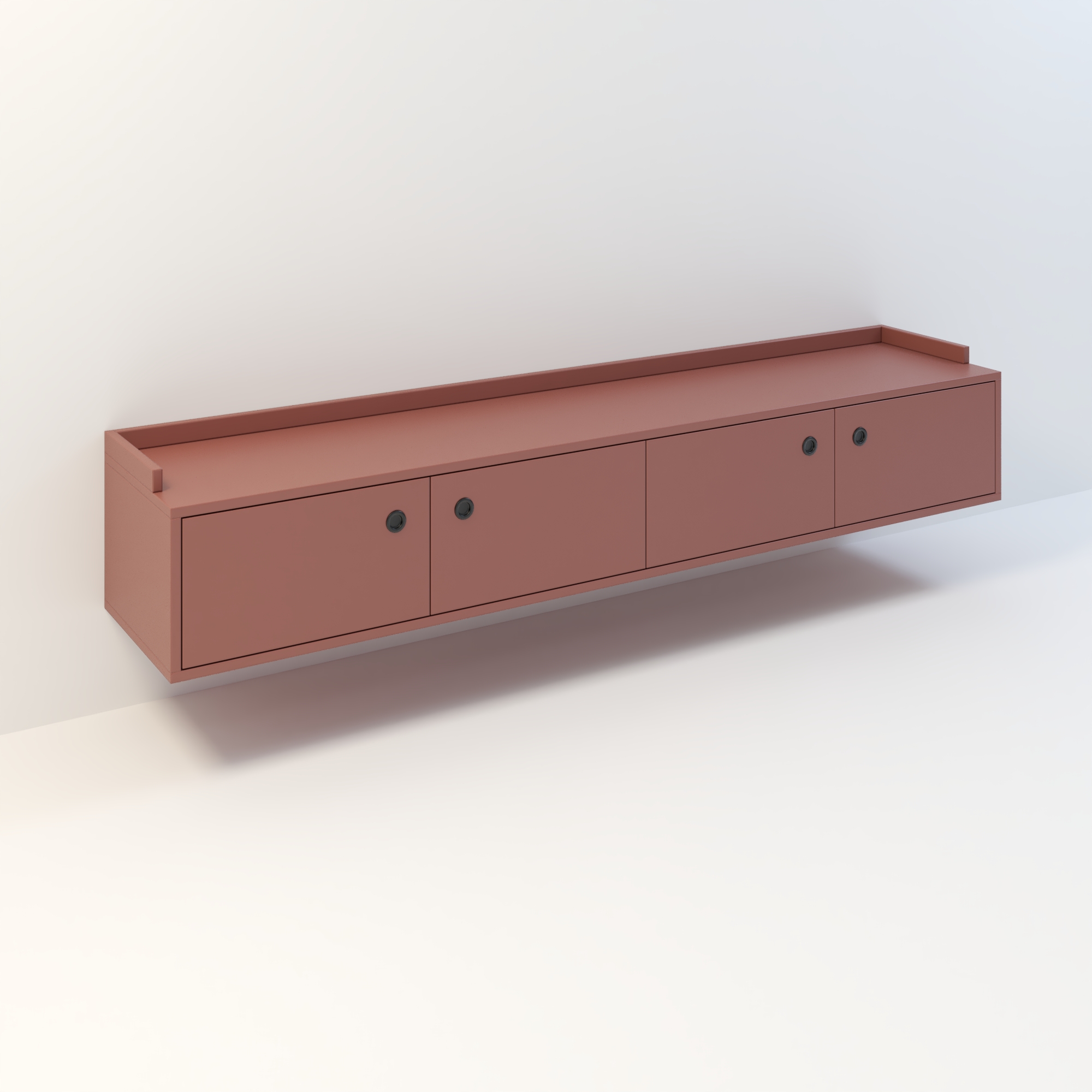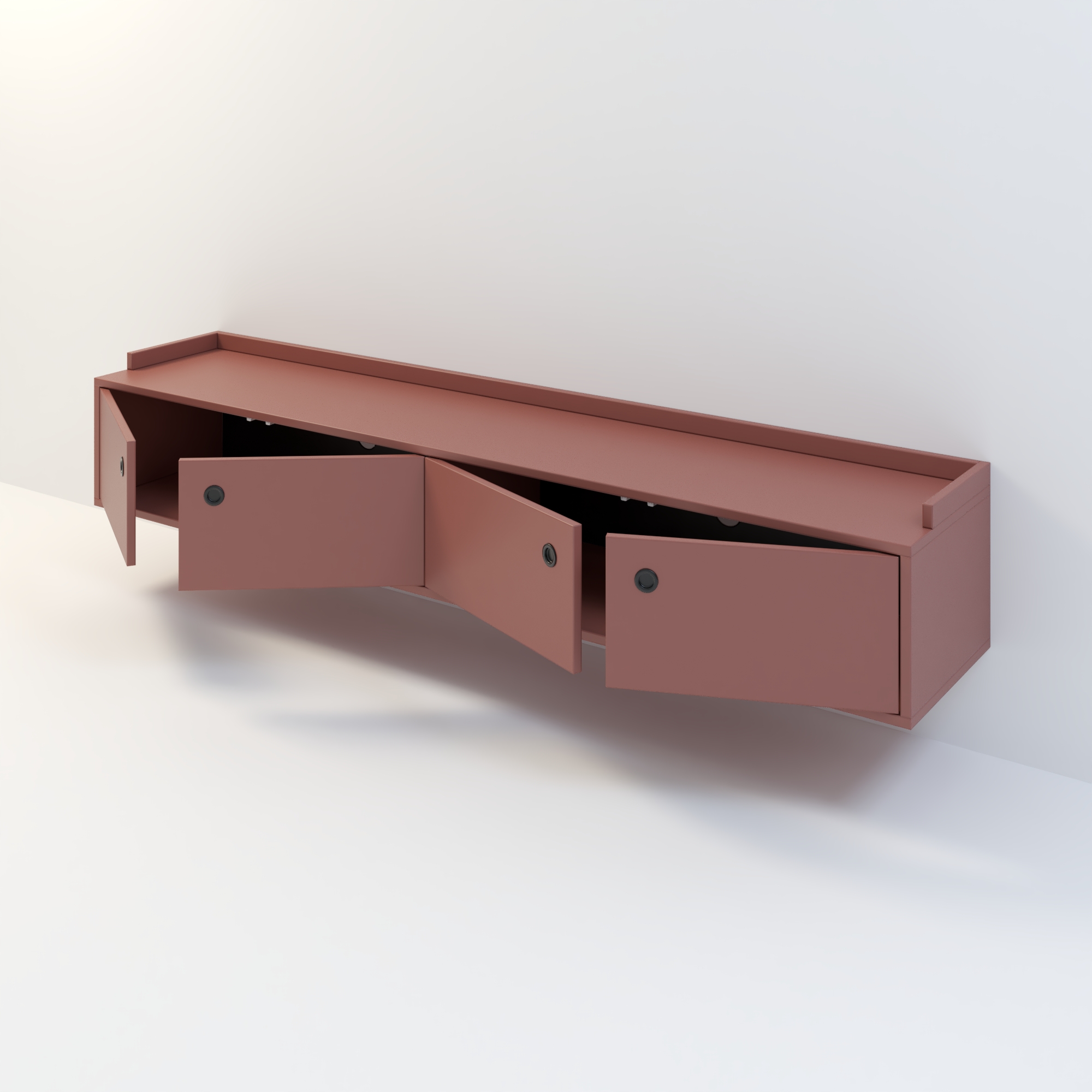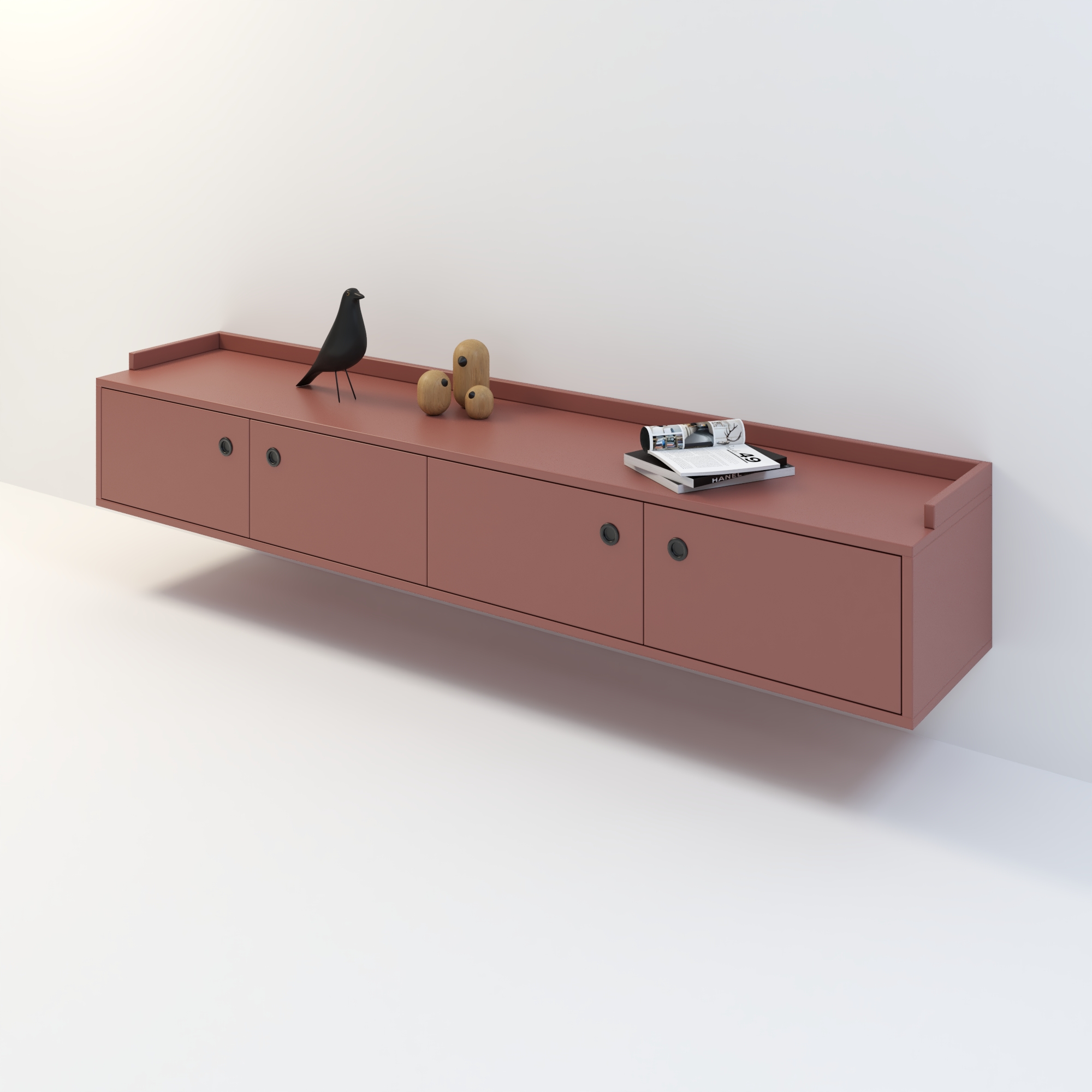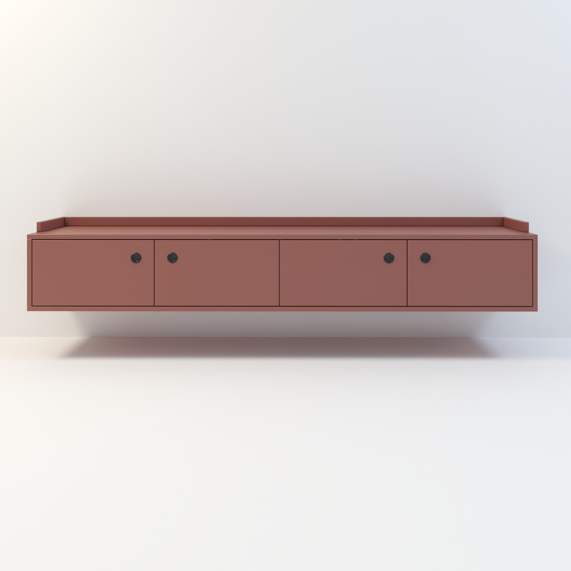 Szafka swoim wzornictwem nawiązuje do stylu japandi. Jest połączeniem japońskiego minimalizmu ze skandynawskim ciepłem i prostotą. Drzwi wyposażone zostały w zawiasy z cichym systemem domykania. Konstrukcja umożliwia przechowywanie w wielu różnych konfiguracjach. Szafka w całości wykonana z wysokiej jakości płyty laminowanej w kolorze czerwonym o odcieniu rdzawym. Kolor ten doskonale komponuje się z naturalnym drewnem i jego reprodukcjami oraz innymi odcieniami koloru czerwonego.