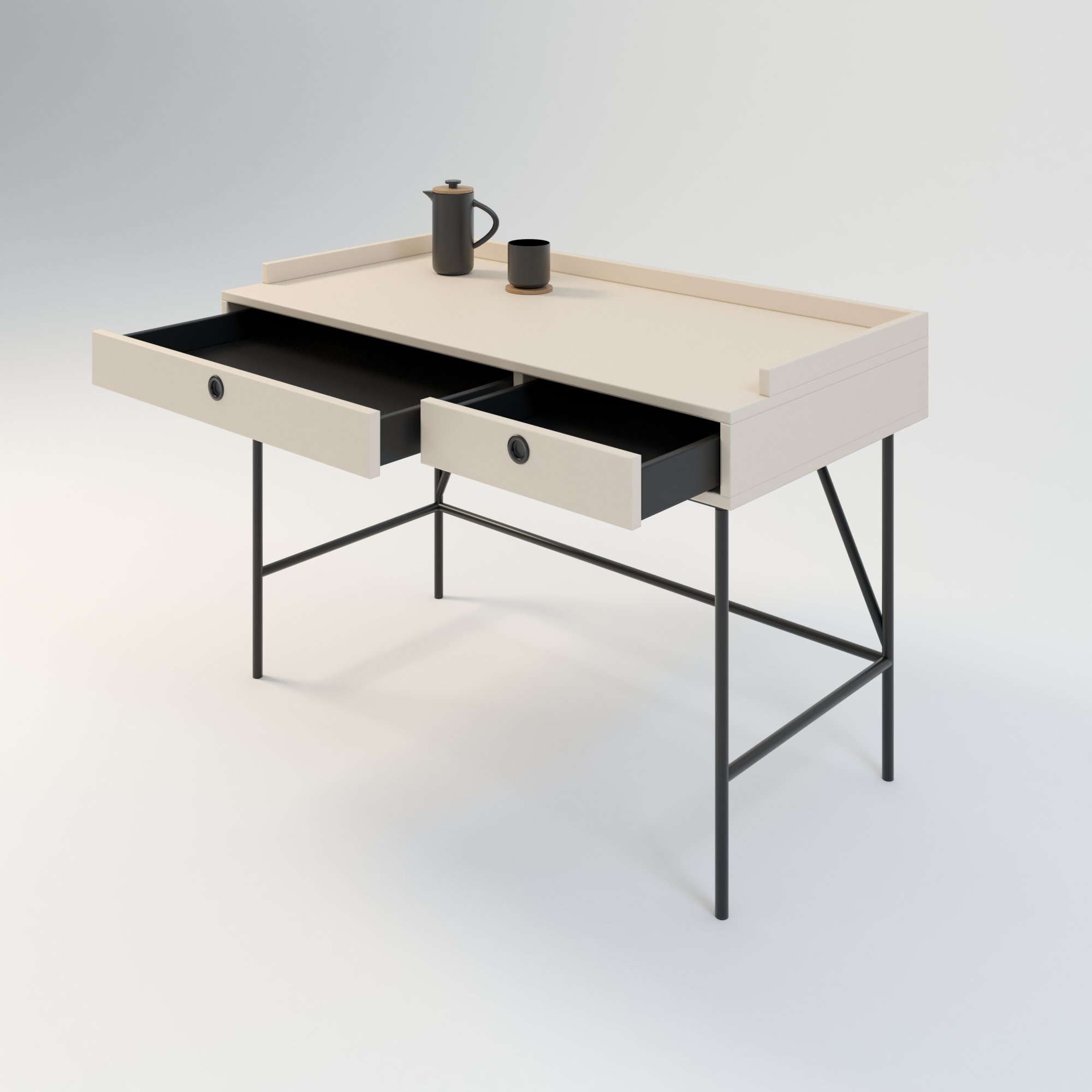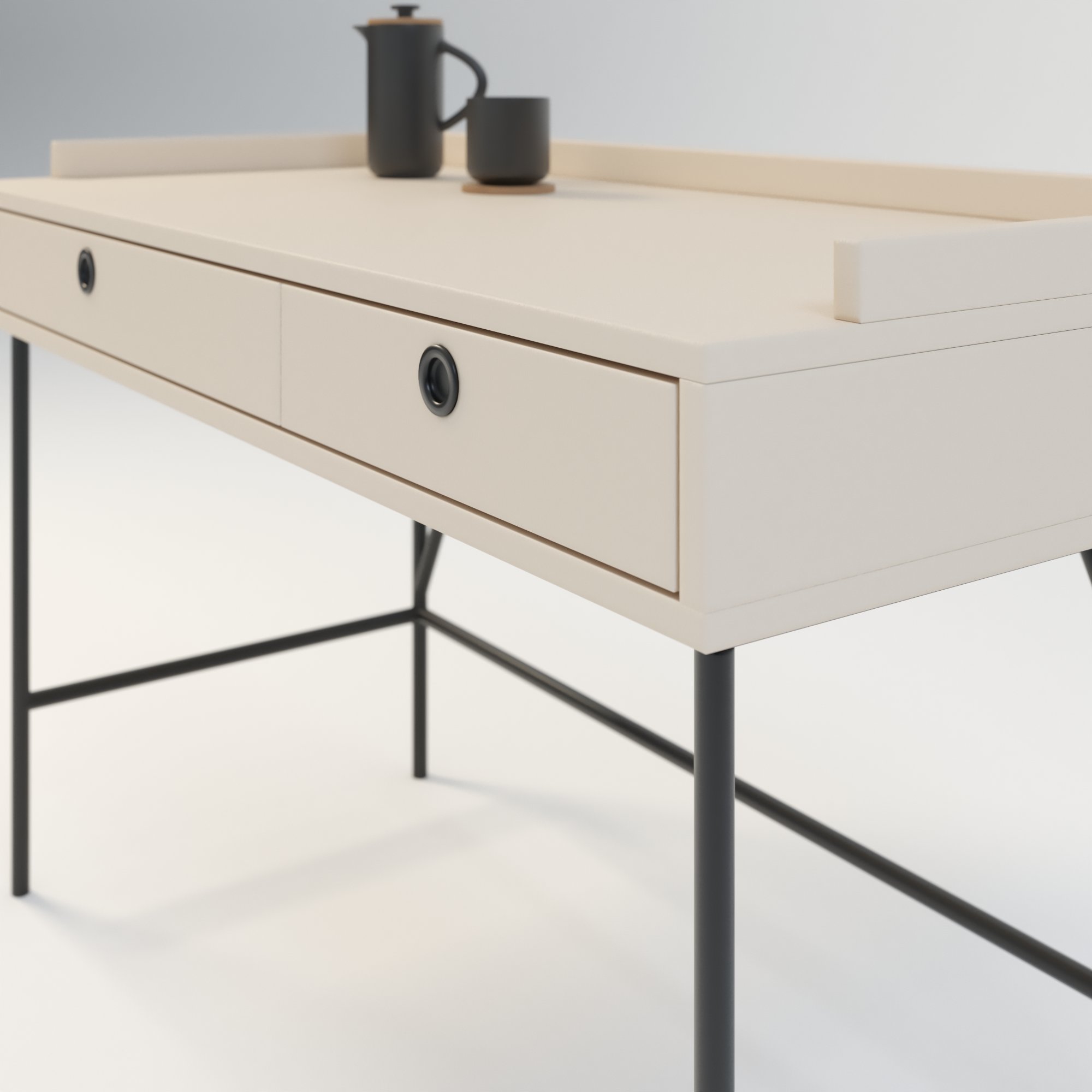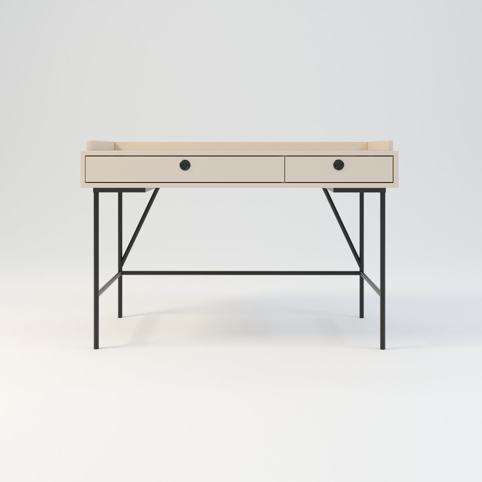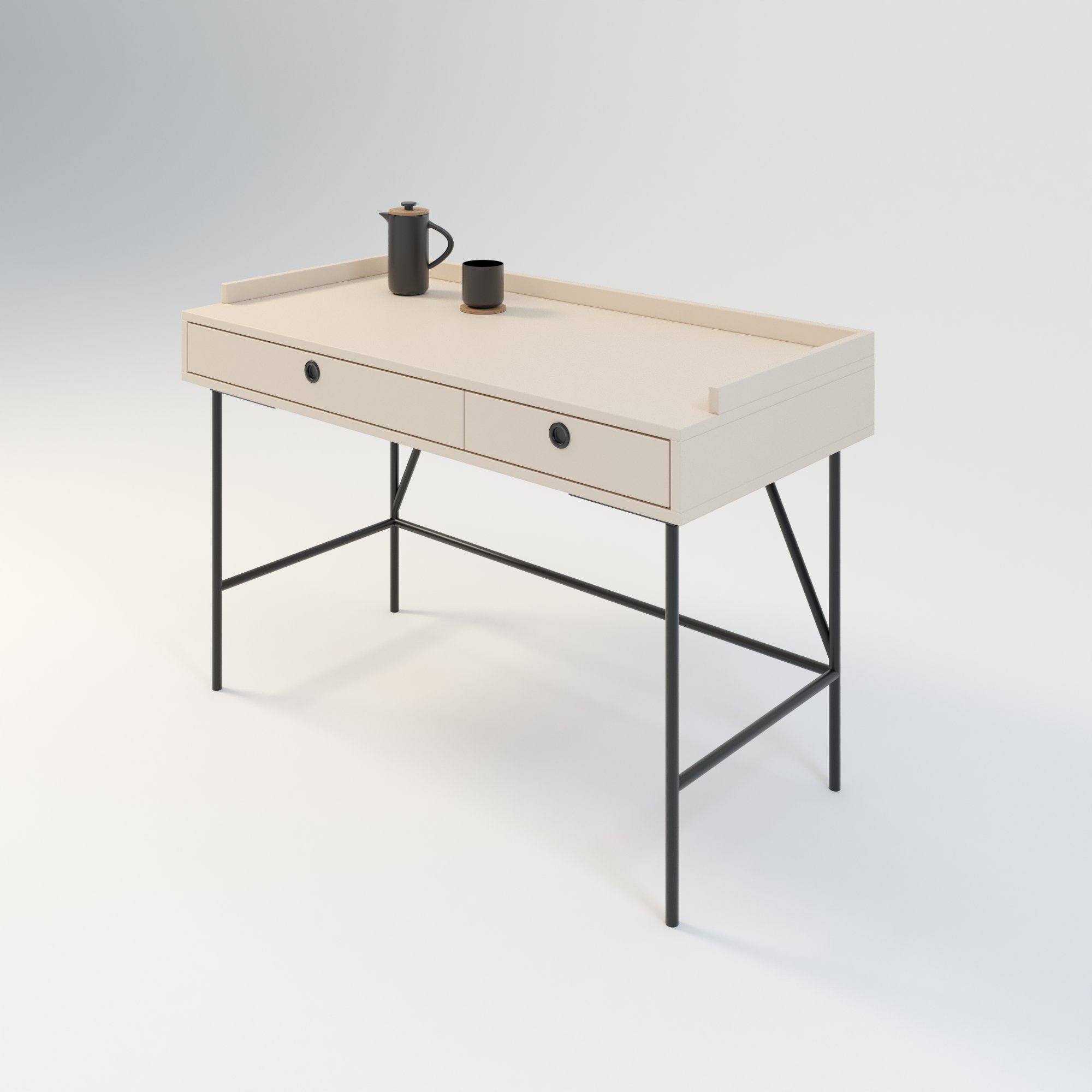 Toaletka w stylu minimalistycznym. Zaprojektowana z myślą o osobach ceniących sobie prostotę i elegancję. Posiada 2 funkcjonalne szuflady. Wykonana w całości z wysokiej jakości płyty laminowanej w kolorze beżowym o odcieniu piaskowym. Kolor ten doskonale sprawdza się połączeniu z innymi kolorami.
